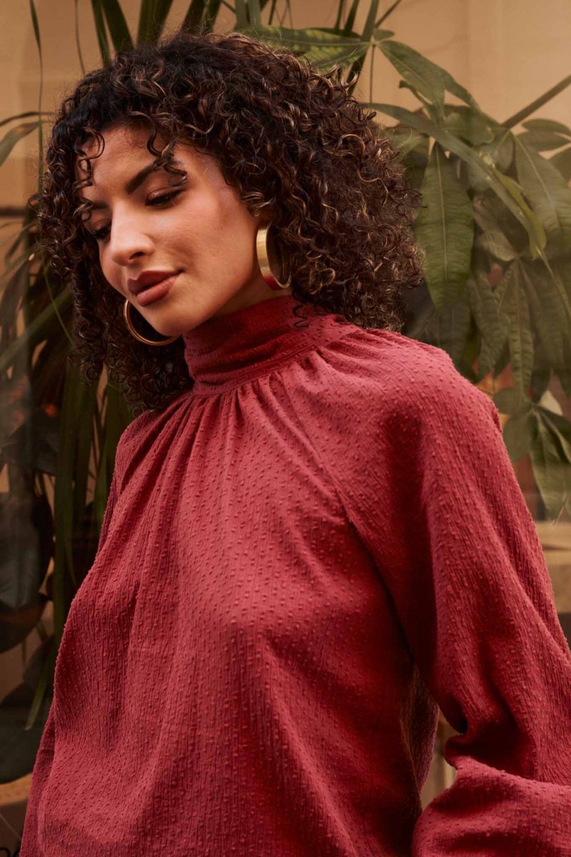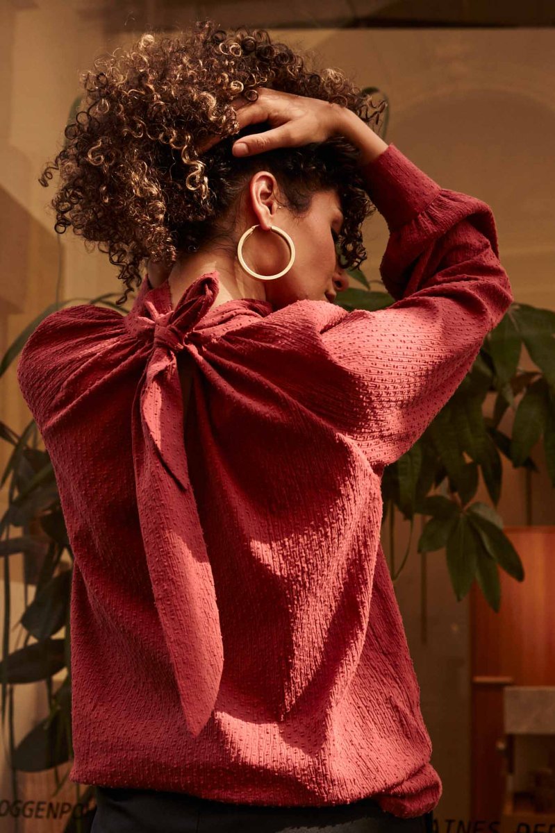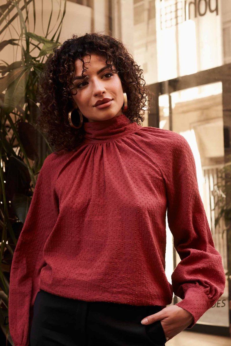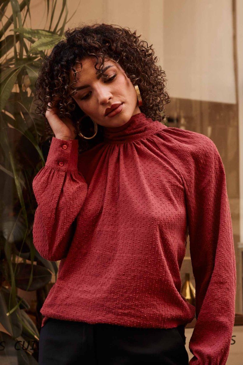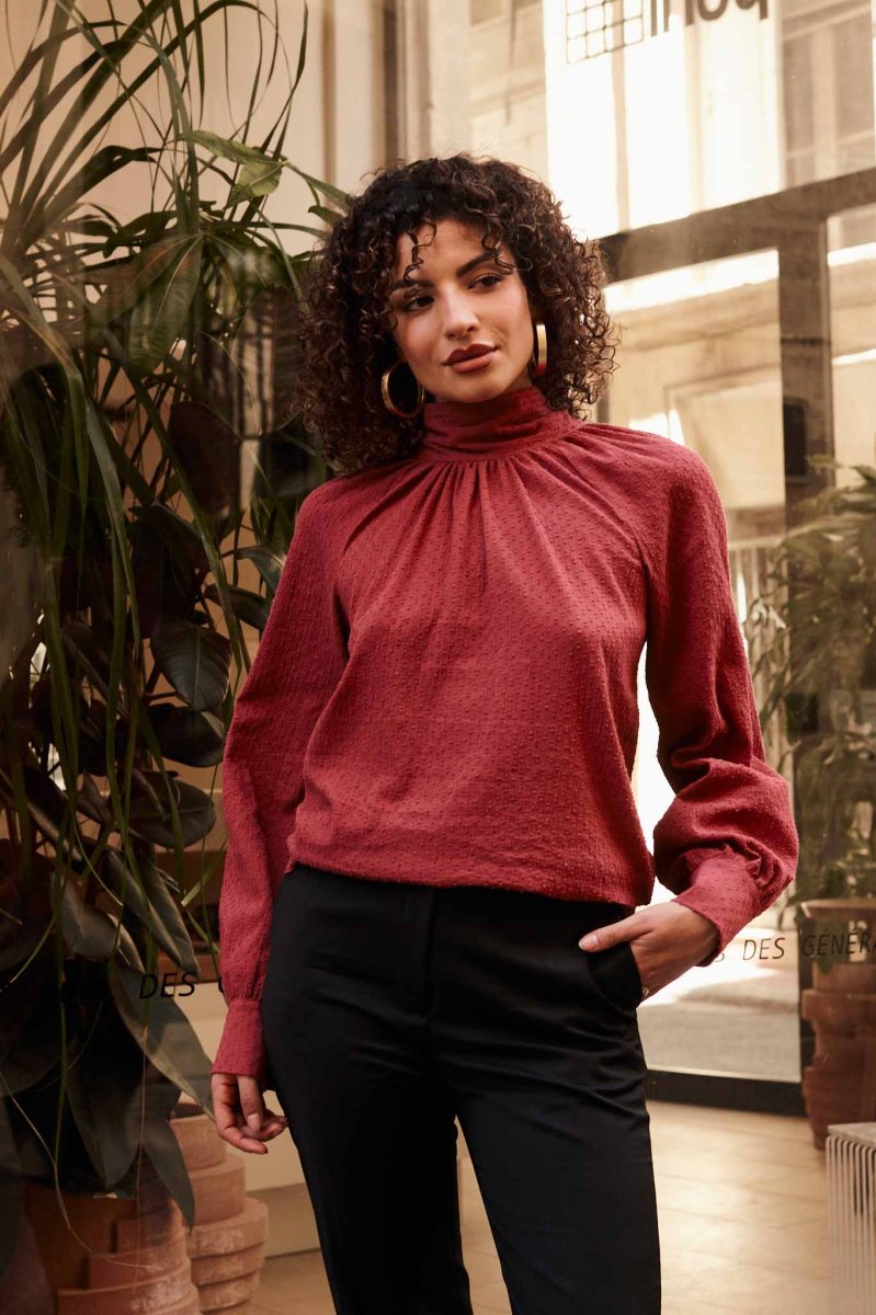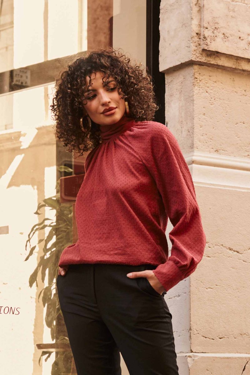 La blouse femme en coton biologique couleur brique est une pièce chic et intemporelle, essentielle pour une garde-robe éco-responsable.