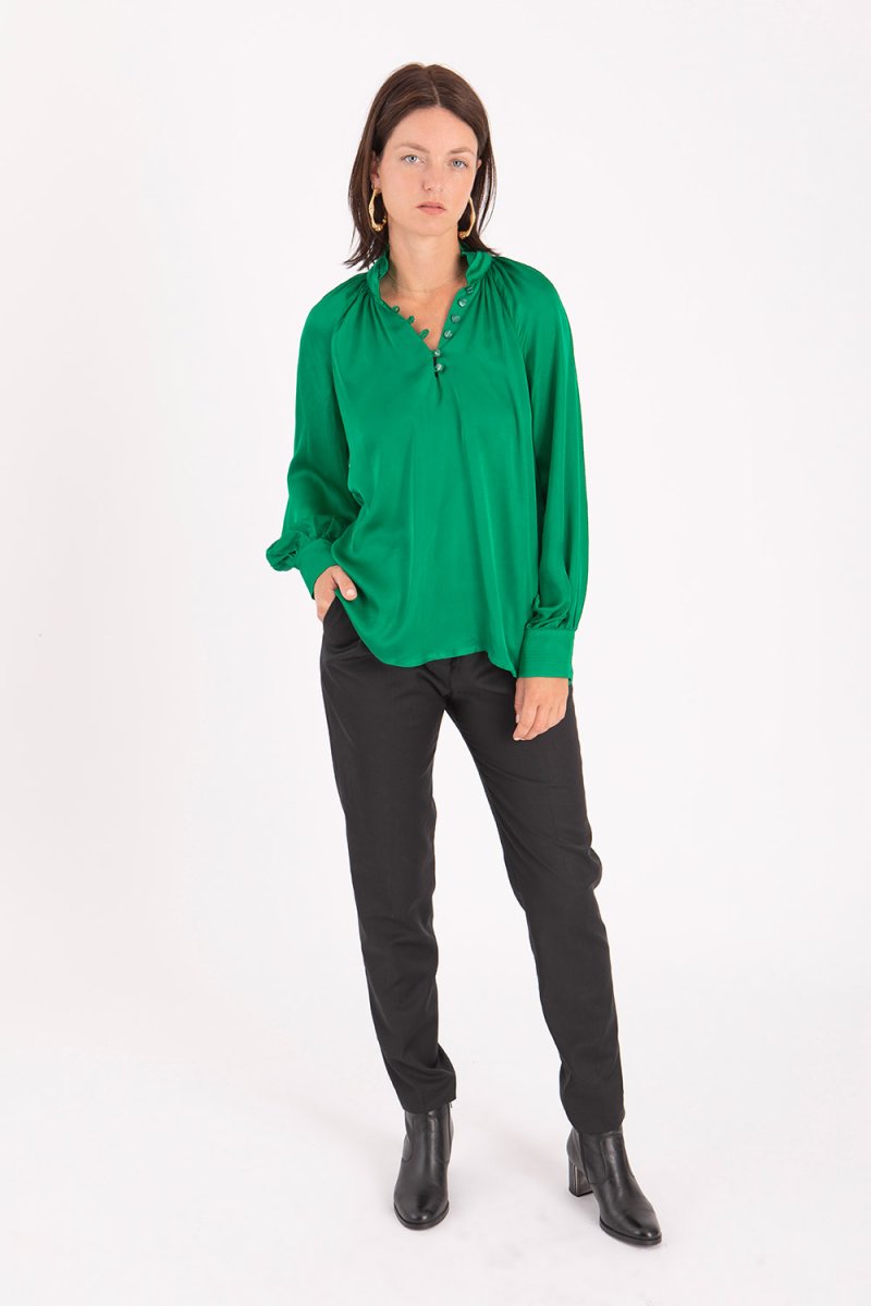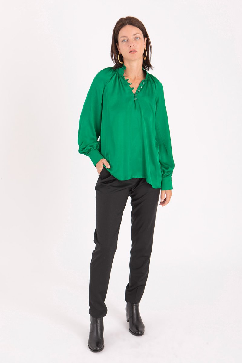 Notre blouse “Émeraude Élégance” incarne le chic à la française avec une touche moderne. Fabriquée en France dans notre atelier à Montpellier avec un soin particulier, cette pièce unique allie style et confort pour sublimer votre garde-robe.