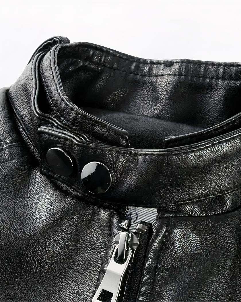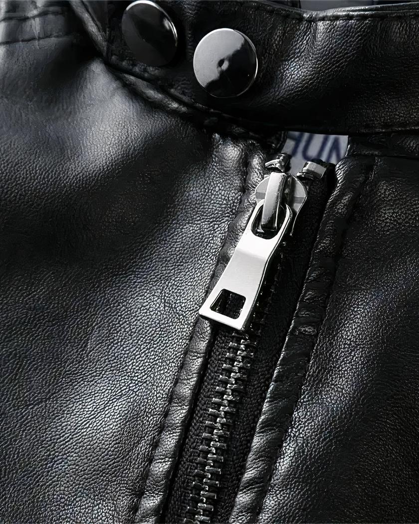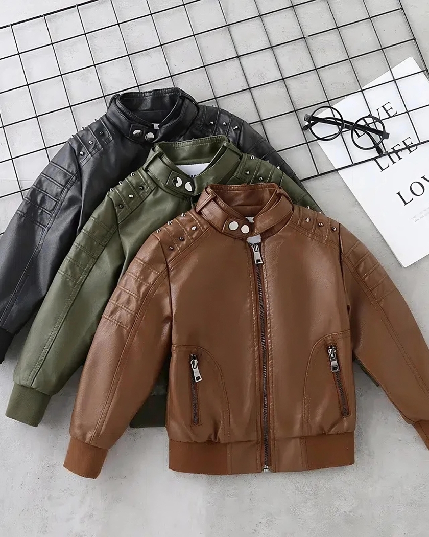 Ce blouson à col rond en simili cuir pour garçon est élégant et fonctionnel. Il est disponible en trois coloris au choix : kaki, noir et marron. Il présente des détails soignés tels qu’une imitation de clous sur les épaules, deux poches latérales pratiques et des coutures impeccables.
