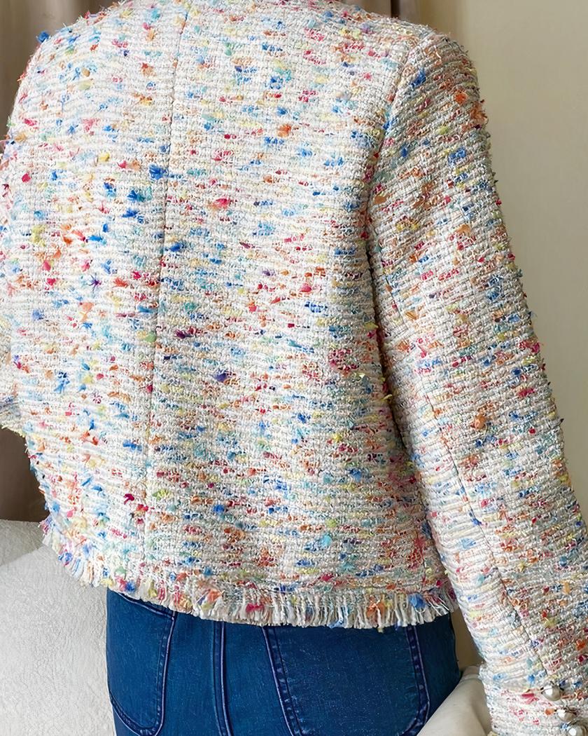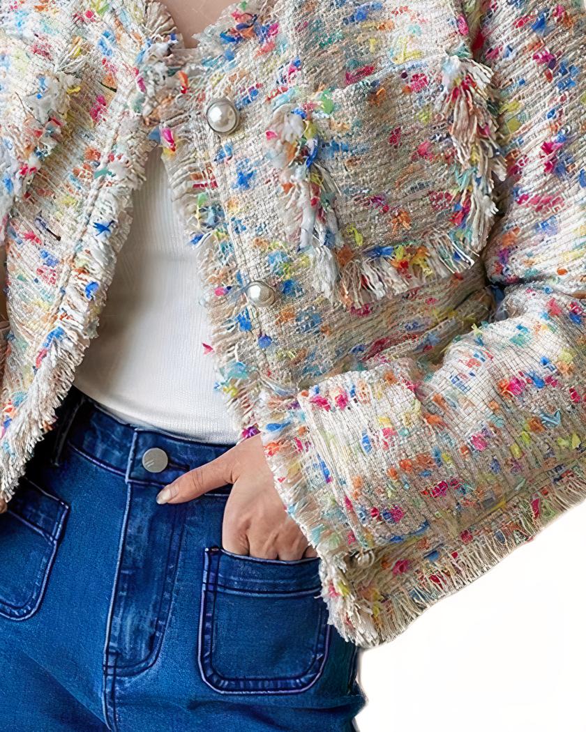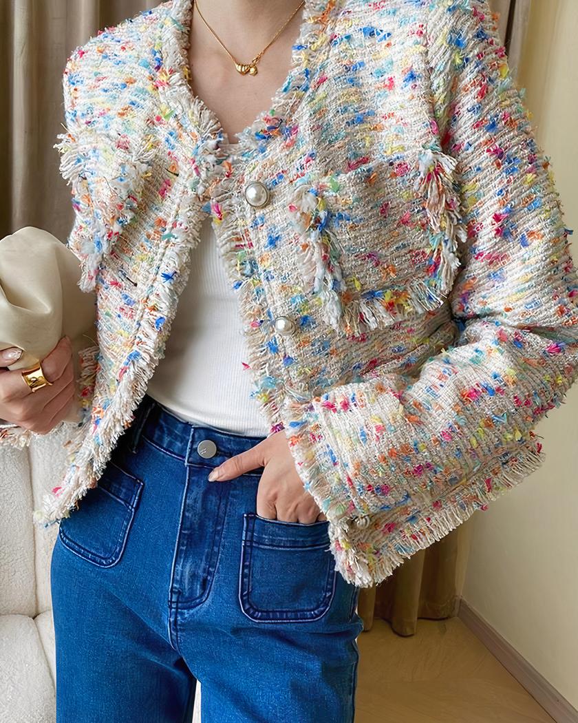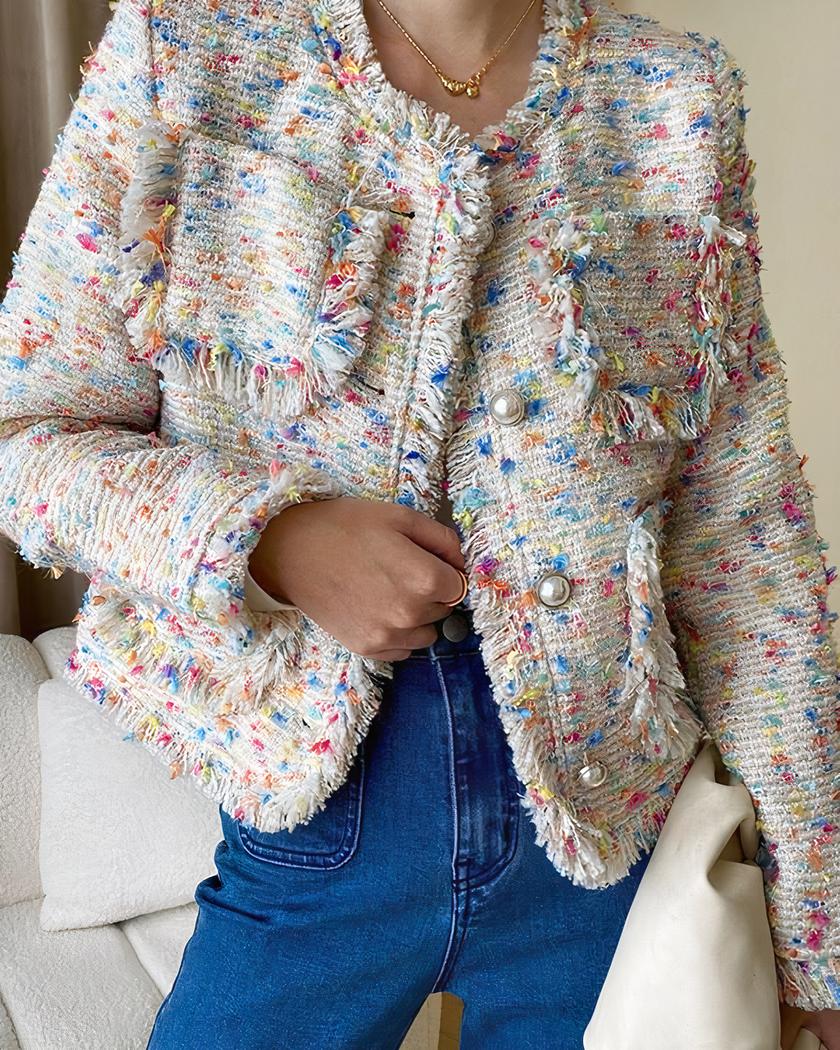 Le blouson col rond en tweed coloré pour femme est un véritable atout pour votre garde-robe. Avec son col rond, son boutonnage simple et ses manches longues, il allie style et praticité. Son motif multicolore booste votre tenue, tandis que ses multi-poches vous permettent de garder vos essentiels à portée de main.