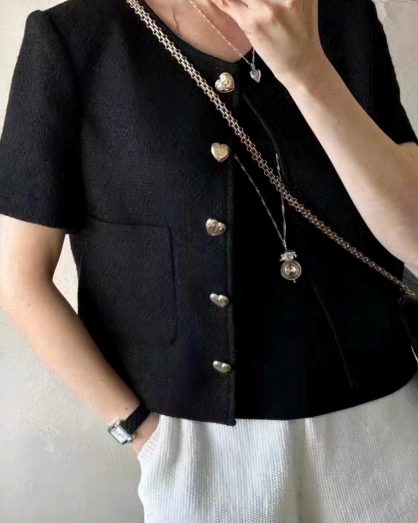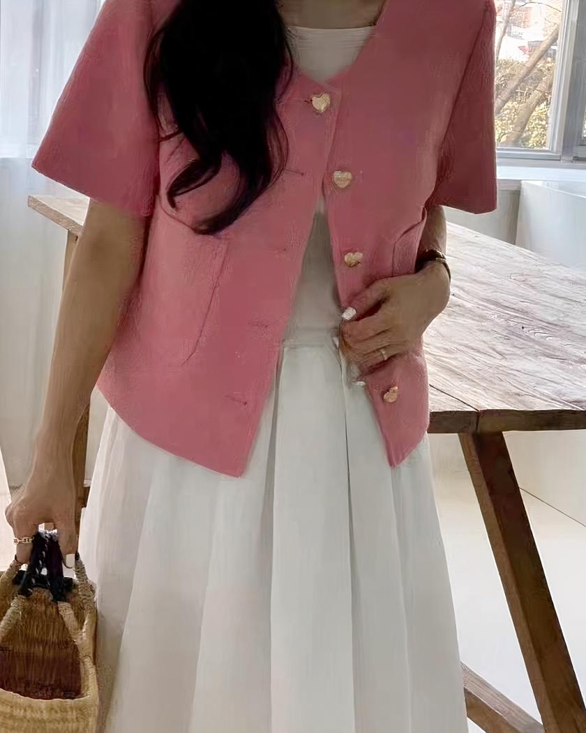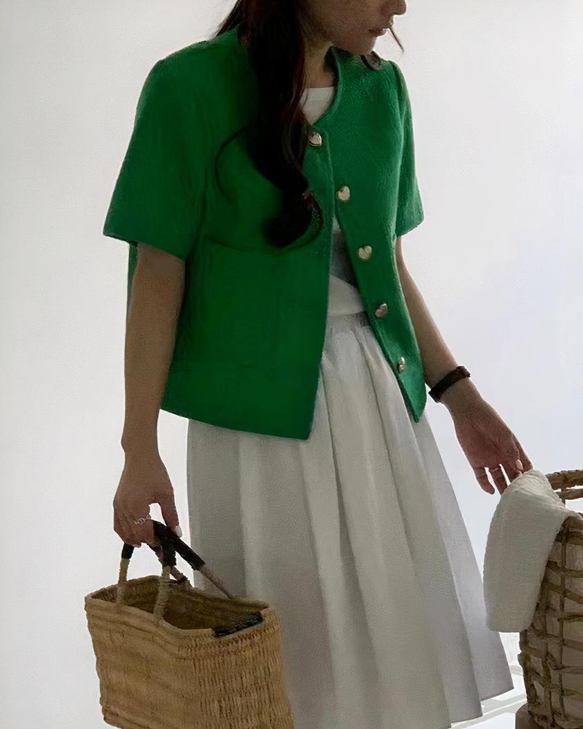 Découvrez le blouson d’été élégant pour femme qui ajoutera une touche de style raffiné à votre garde-robe estivale. Avec son boutonnage simple en forme de cœur, son blouson court et son col rond flatteur, ce vêtement est conçu pour allier élégance et confort. Les deux poches à l’avant ajoutent une note pratique à l’ensemble
