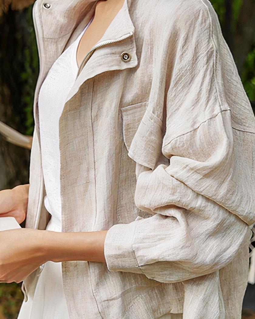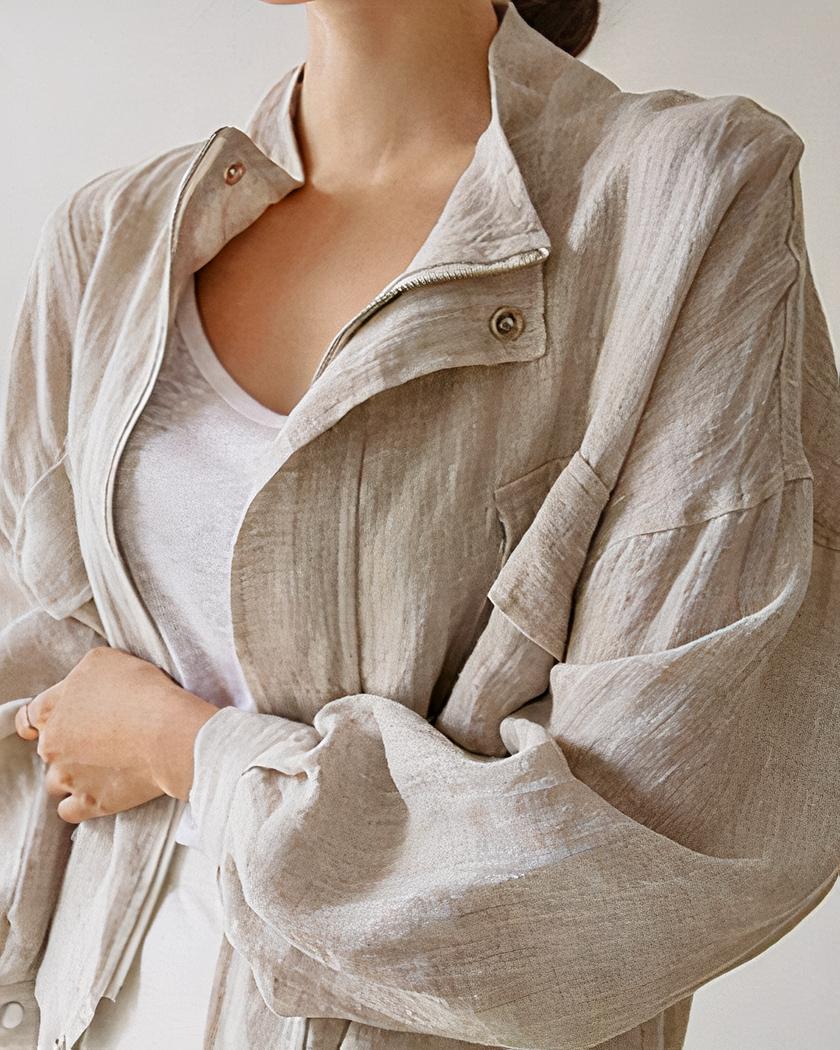 Préparez-vous à affronter l’été avec style et confort grâce à ce magnifique blouson pour femme en coton et lin. Conçu spécialement pour les journées estivales, ce blouson décontracté combine à la perfection une coupe ample, une fermeture à glissière pratique et des détails soignés pour vous offrir une tenue estivale aussi élégante que confortable.