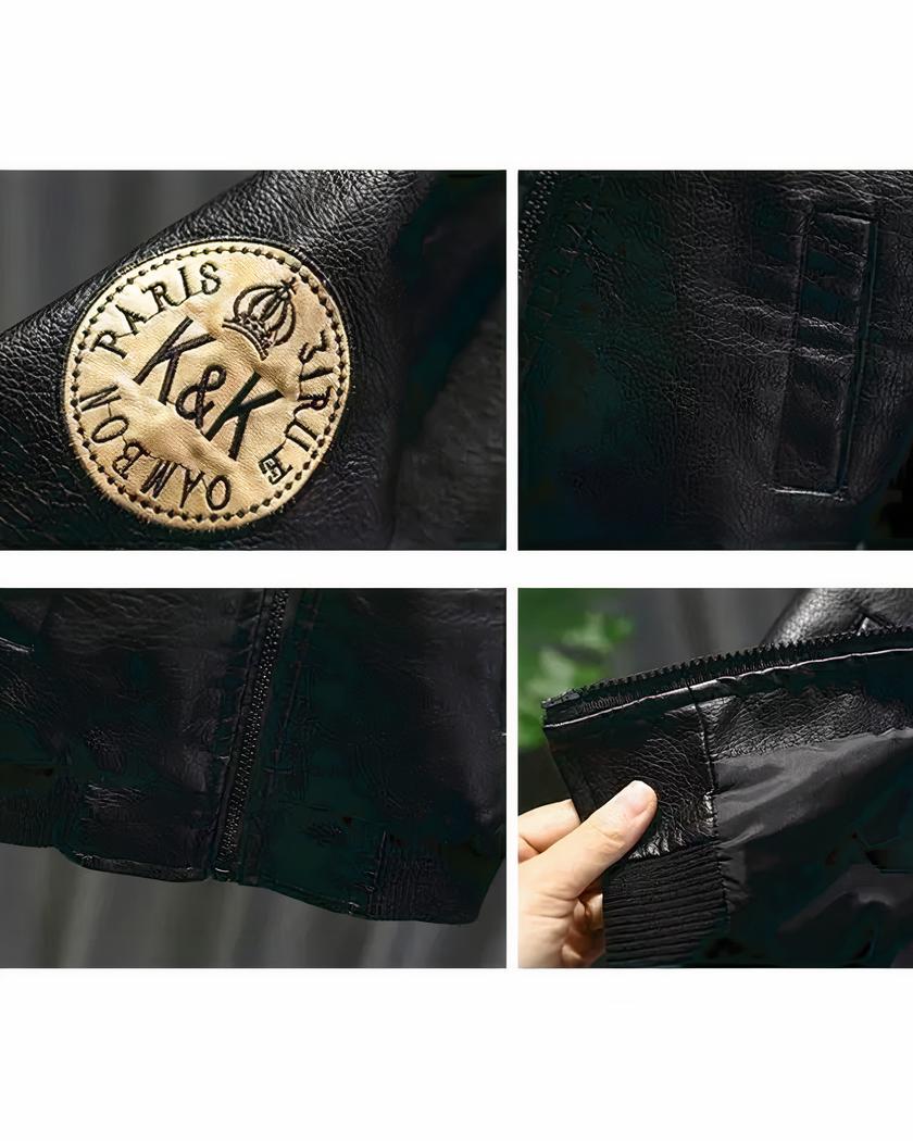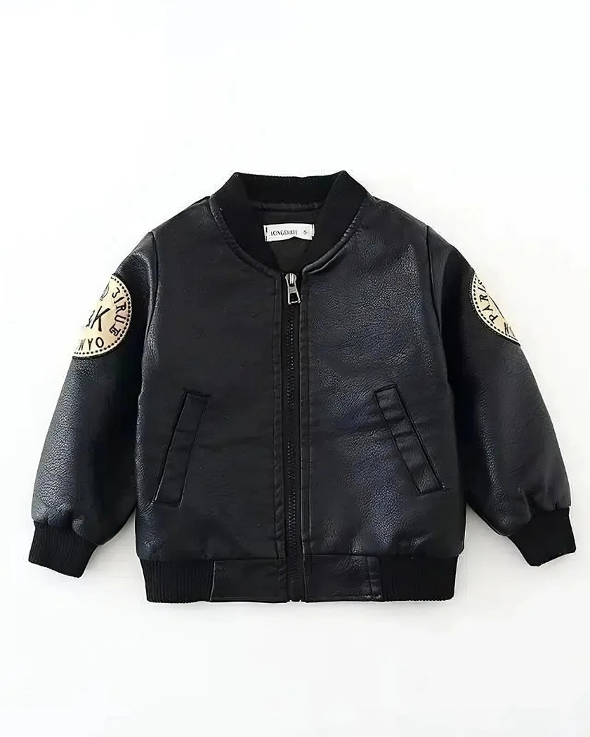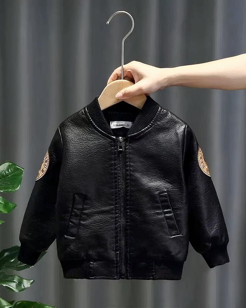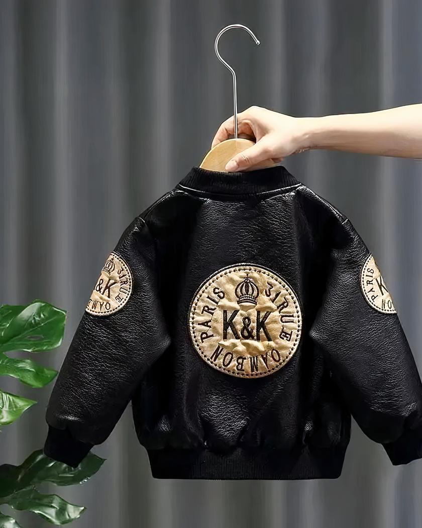 Ce blouson large en simili cuir pour garçon, avec sa coupe large et sa fermeture éclair, est parfait pour un look vintage tendance. Son simili cuir épais apporte robustesse et style, tandis que le motif original sur les manches et le dos ajoute une touche d’originalité.