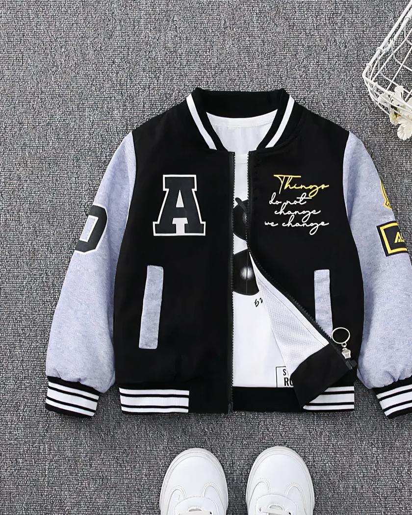 Ce blouson teddy pour garçon à fermeture éclair est un incontournable au style décontracté, prisé par les étudiants américains. Arborant de jolis motifs humoristiques, il est disponible en vert ou noir. Parfait pour apporter une touche de fantaisie et de modernité à la tenue de votre enfant.