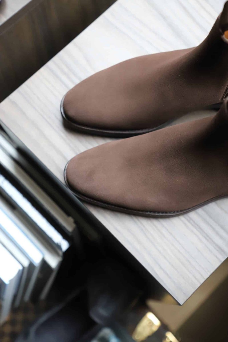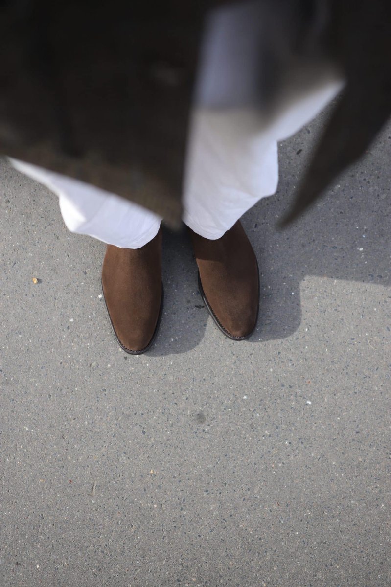 A true Chelsea boot is all about proportions, materials and construction. In other words, the vamp must draw a nice regular curve, ending on an neither too round nor too thin toe, with an elastic stitched on pieces of leather of the right thickness, assembled to form a robust construction (goodyear sewn with a thin rubber sole) and create a well-balanced boot which, from the back, rises in a water drop shape right up to the ankle. It is always more difficult to achieve something simple; what could be simpler, apparently, than preparing a dry martini: gin, vermouth…