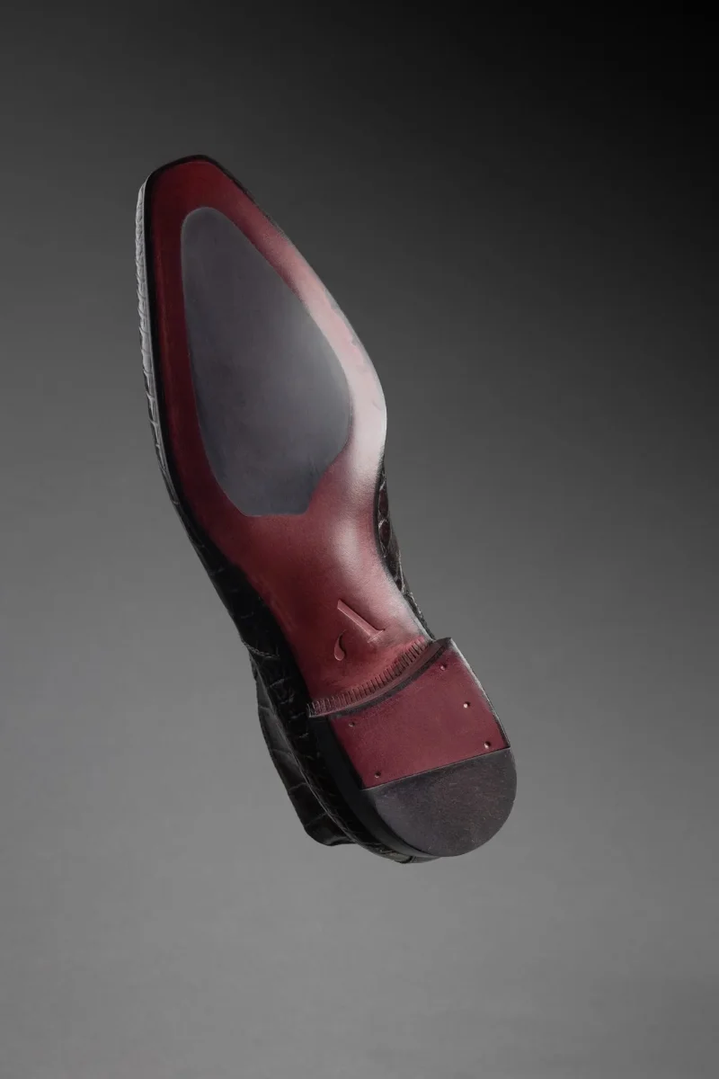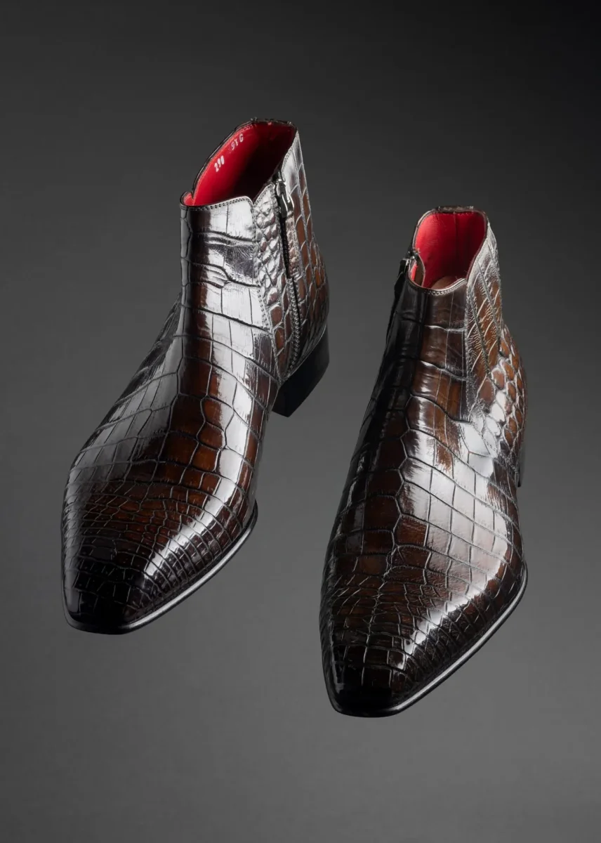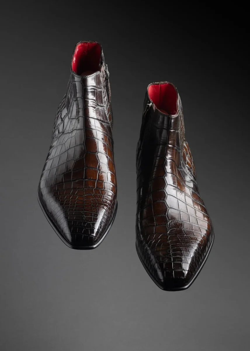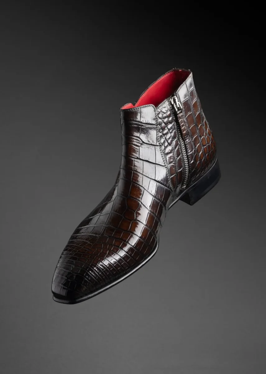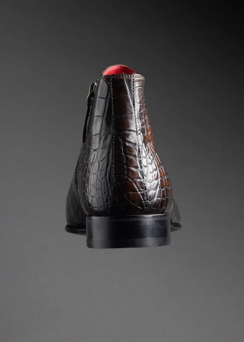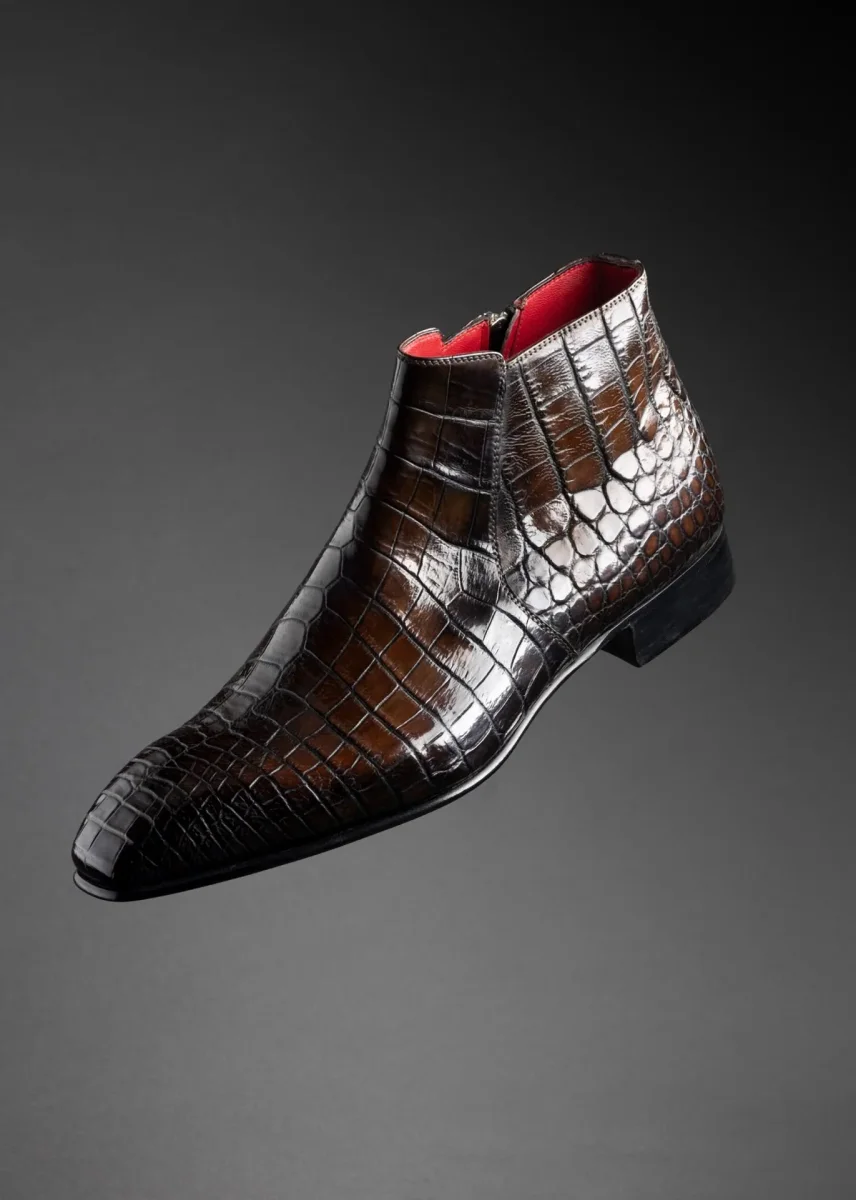 Élégante et racée, cette bottine semi-montante incarne l’excellence du soulier de luxe. Réalisée en cuir de crocodile véritable, elle se distingue par la richesse de son grain naturel, sa brillance maîtrisée et ses nuances profondes de brun patiné.