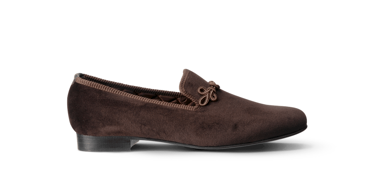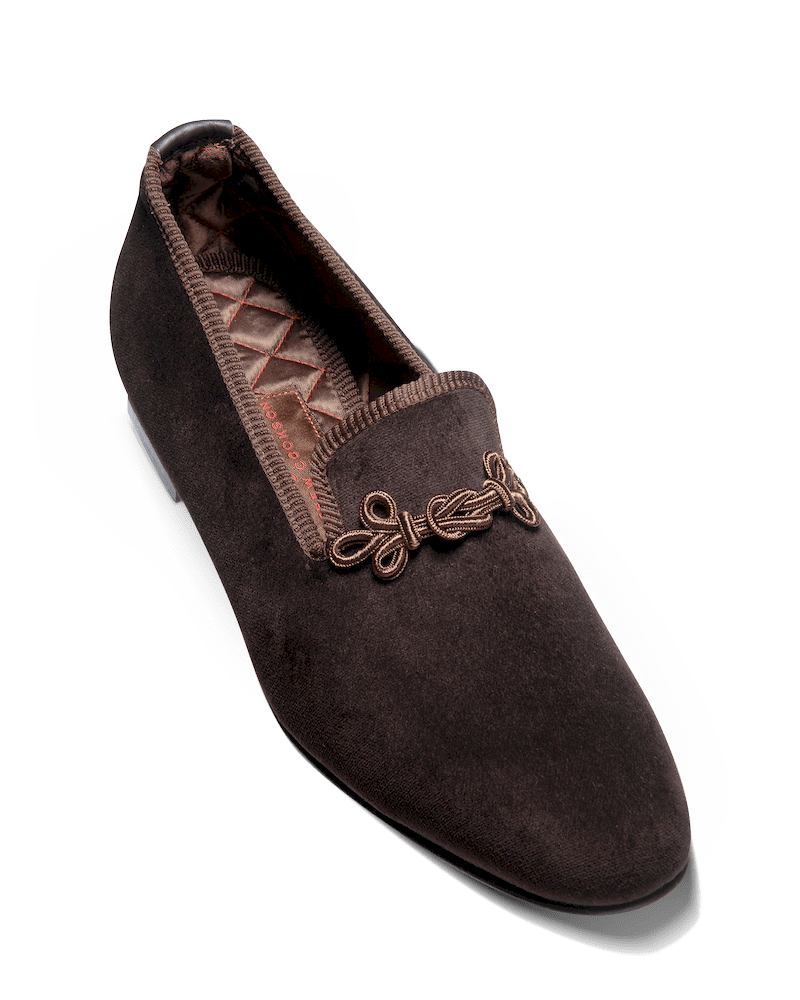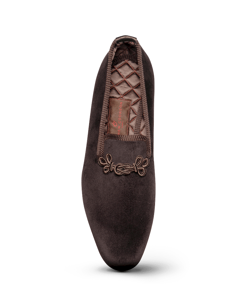 Les slippers brandebourg chocolat Matthew Cookson sont faites en velours de coton, la doublure est en satin matelassé, le tout monté sur une fine semelle en cuir. Le summum de l’élégance et du confort.