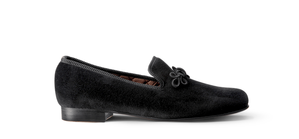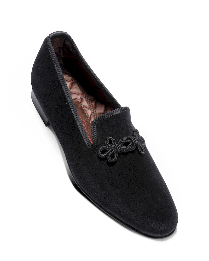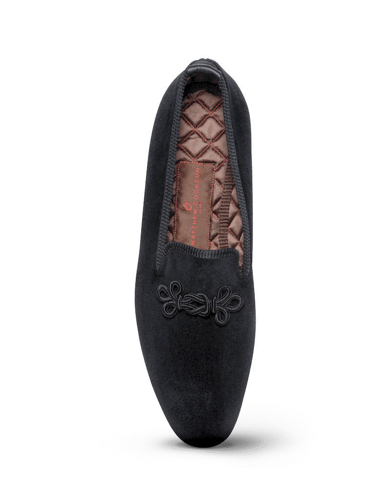Les slippers brandebourg noir Matthew Cookson sont faites en velours de coton, la doublure est en satin matelassé, le tout monté sur une fine semelle en cuir. Le summum de l’élégance et du confort.