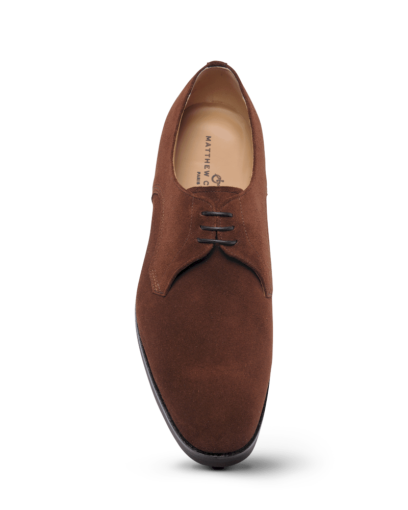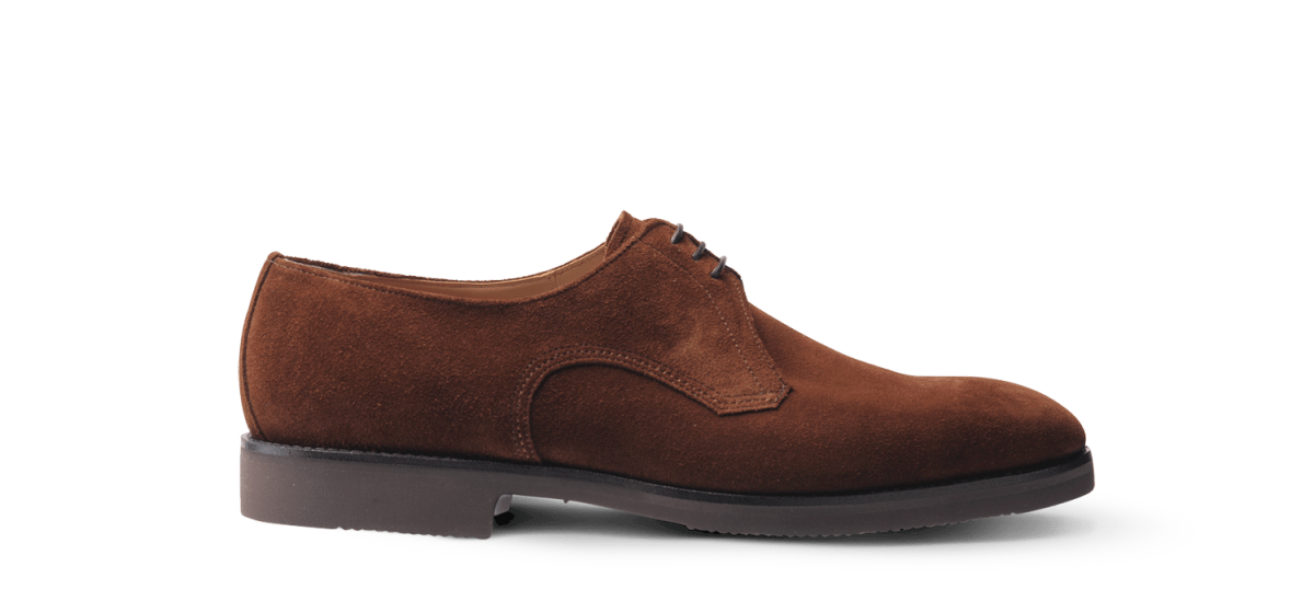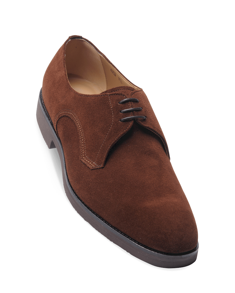 Un derby traditionel en veau velours marron moyen. Cousu blake avec semelle gumlite vibram. Legère et confortable. Commander une demi taille de moins que votre pointure anglaise normale.