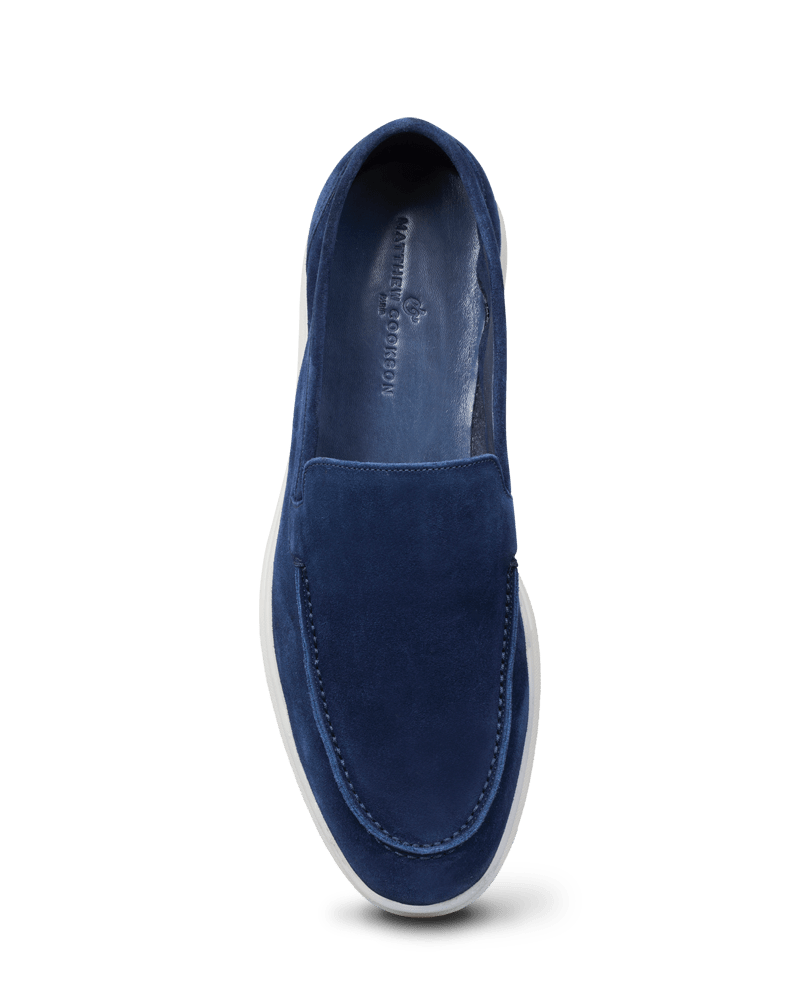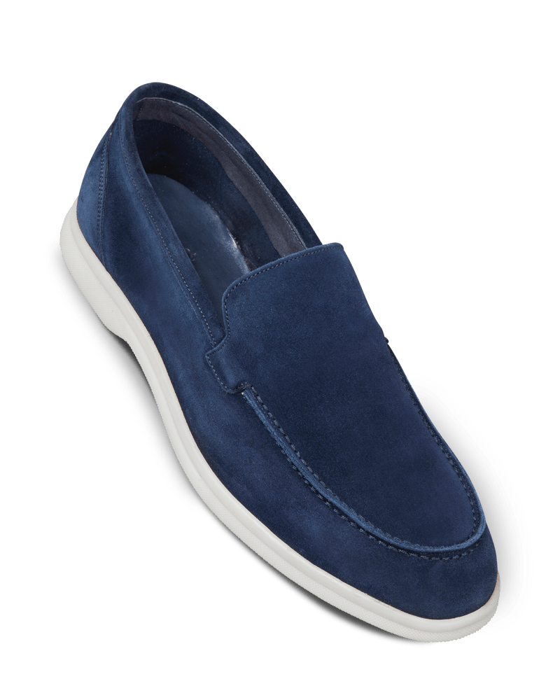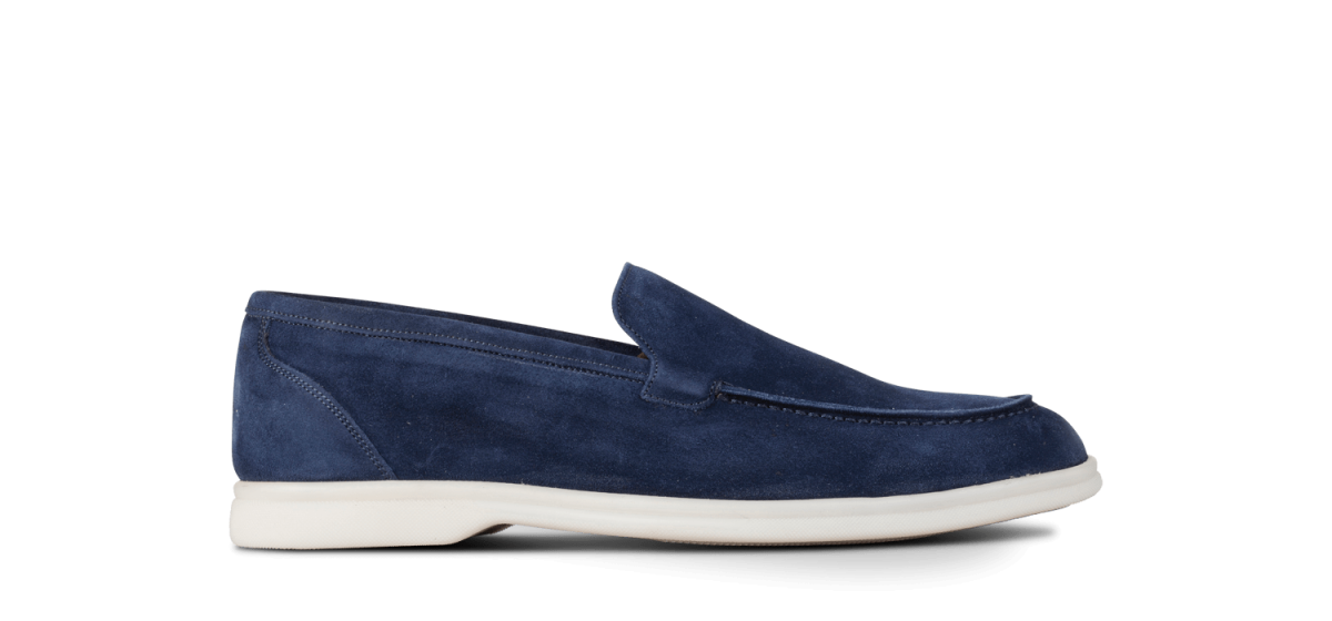 Le nouveau mocassin d’été, Capri en veau velours bleu marine non doublé est monté sur une semelle en gomme légère et très souple.