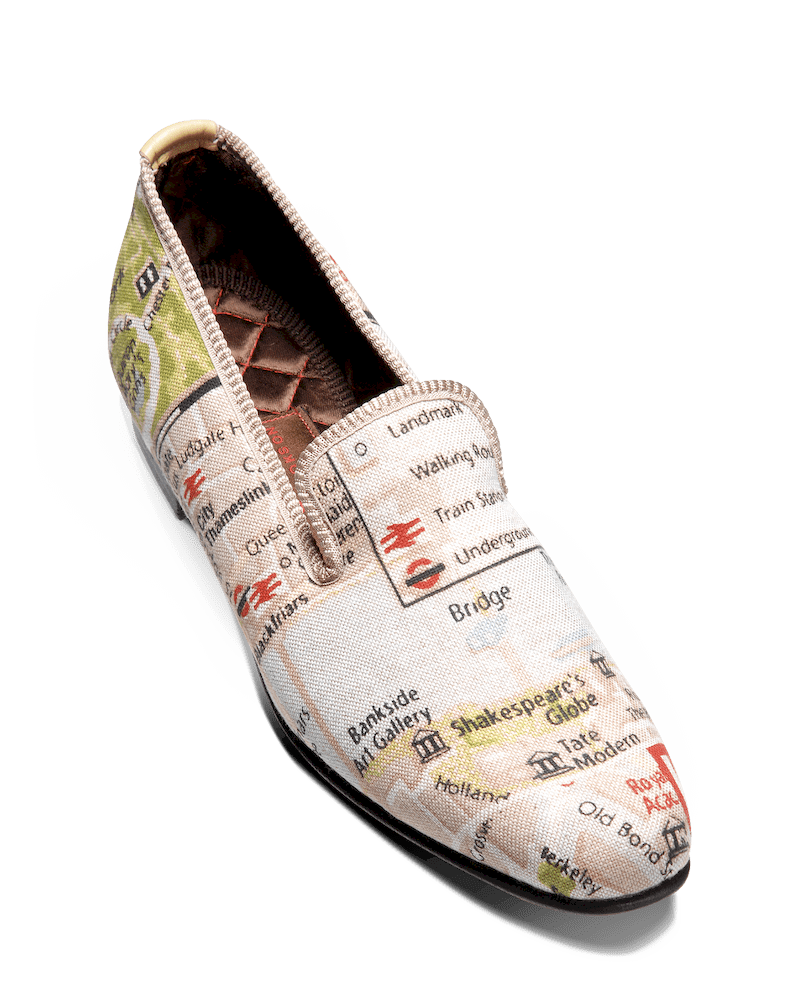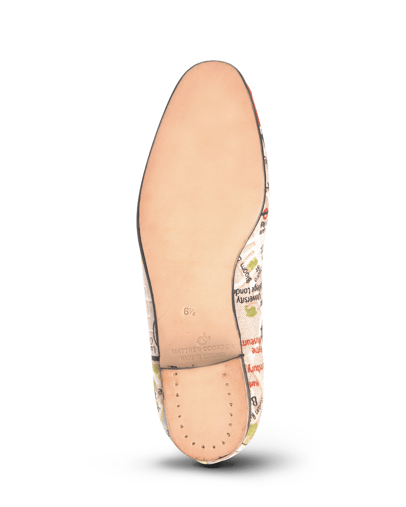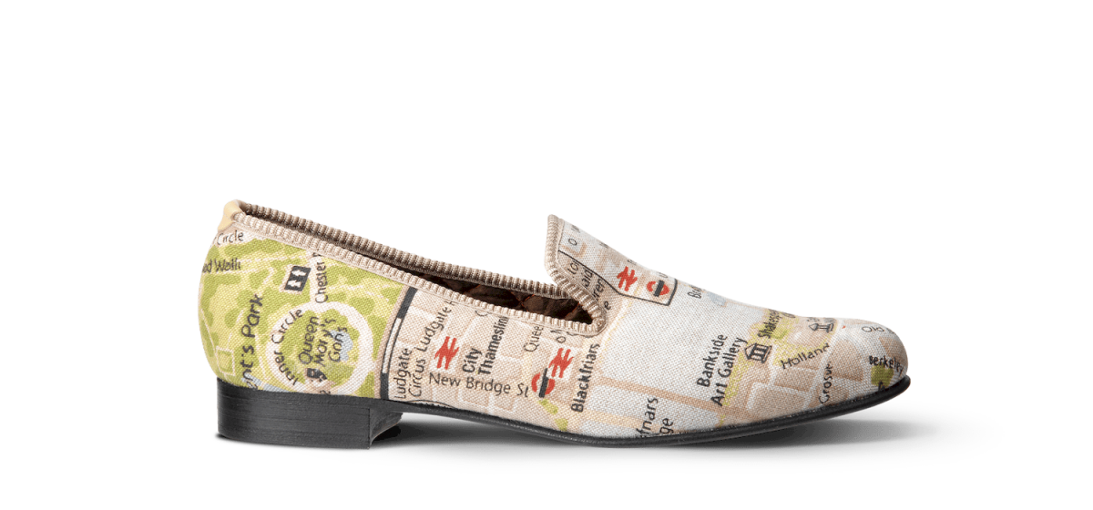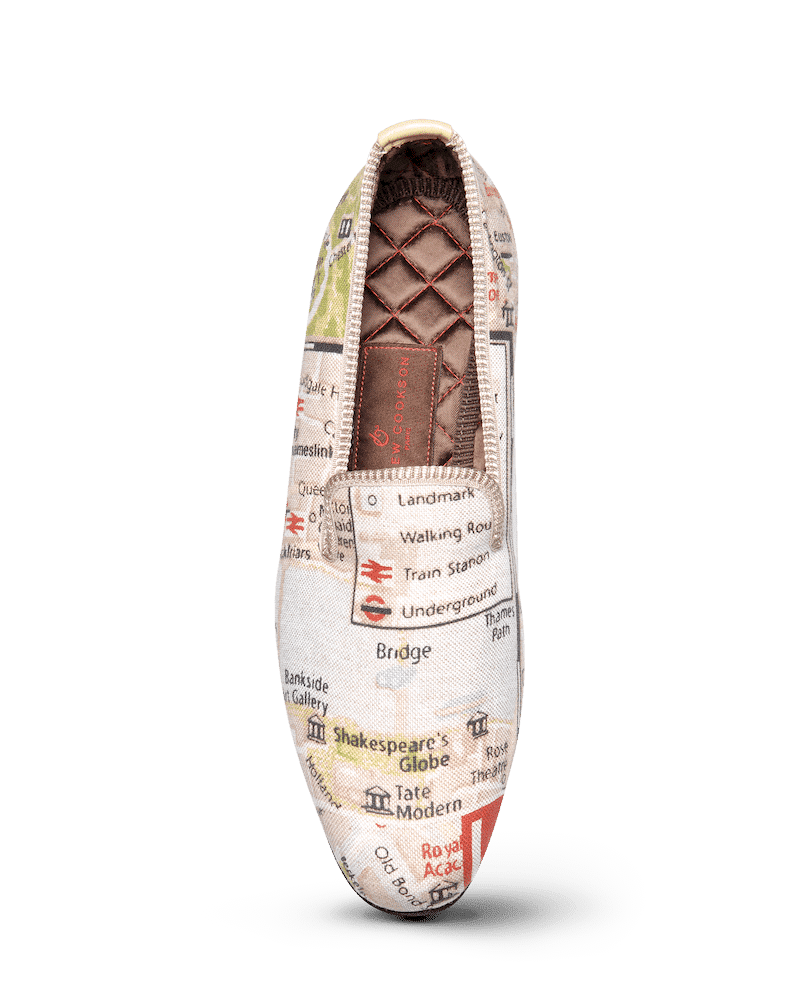 Les slippers carte de Londres Matthew Cookson sont faites en tissu de coton, la doublure est en satin matelassé, le tout monté sur une fine semelle en cuir. Le summum de l’élégance et du confort.