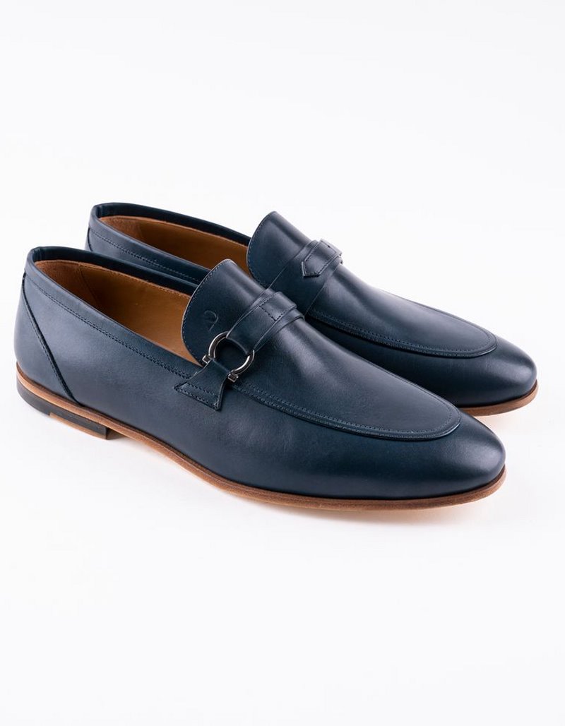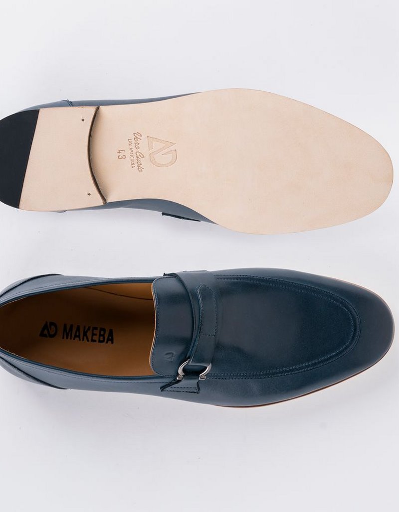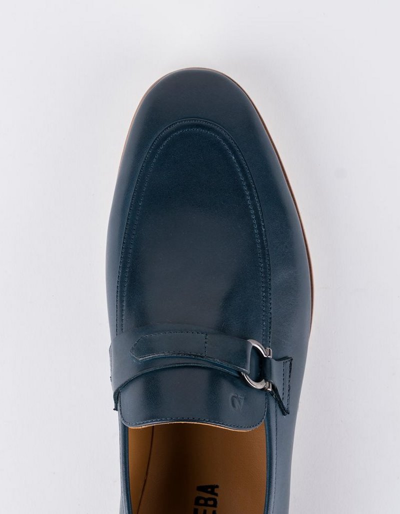 Chaussures en cuir bleu, semelles cuir italien et boucle en acier.