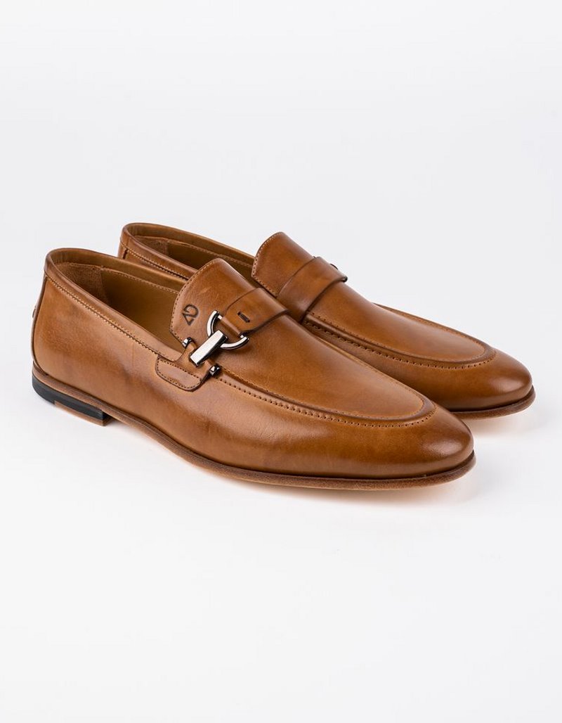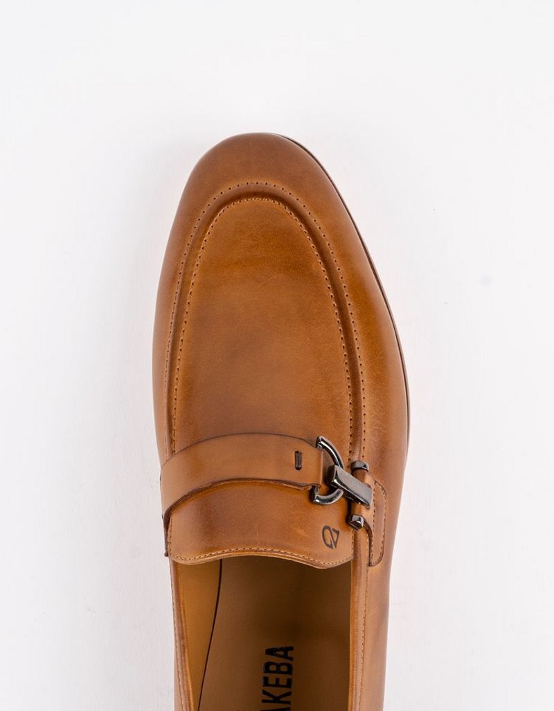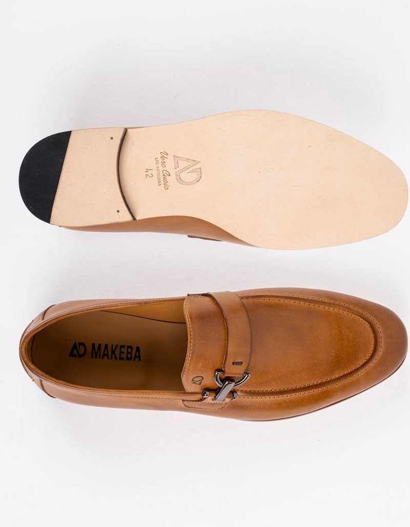 Chaussures en cuir camel, semelles cuir italien et boucle en acier.