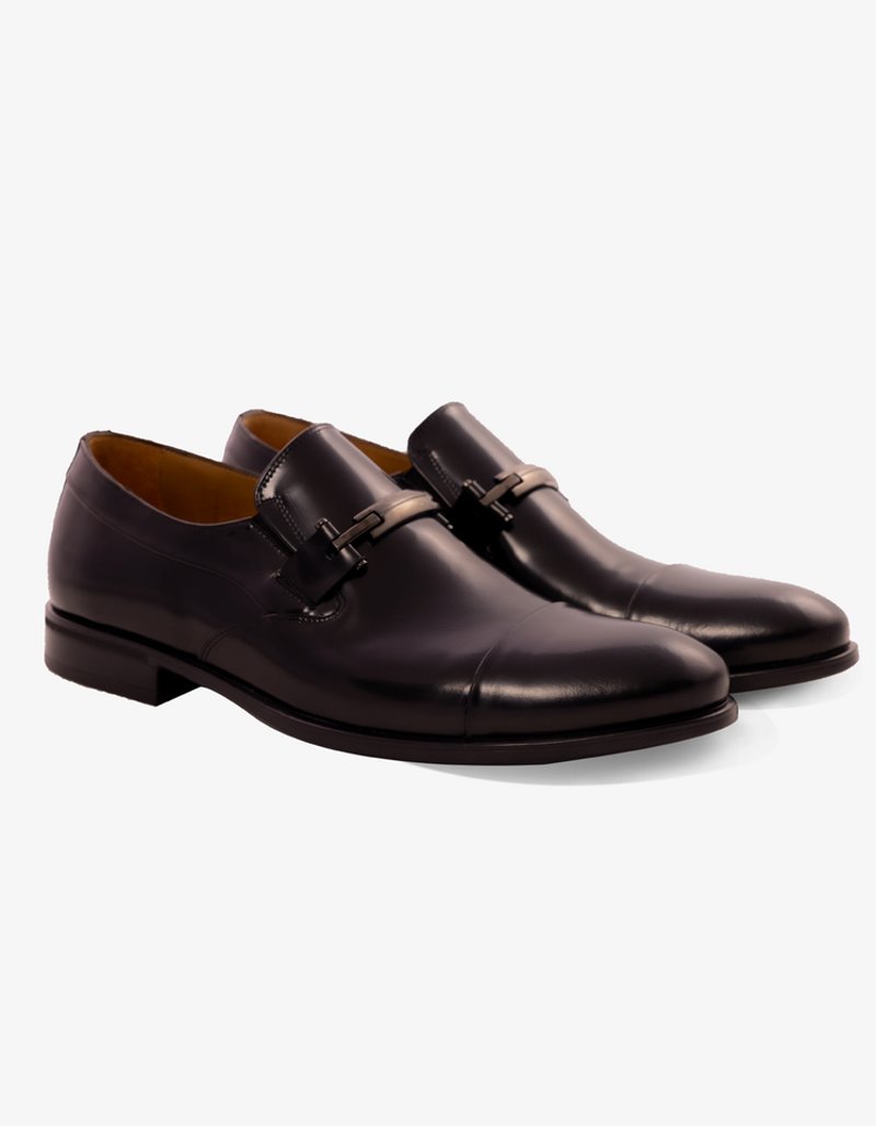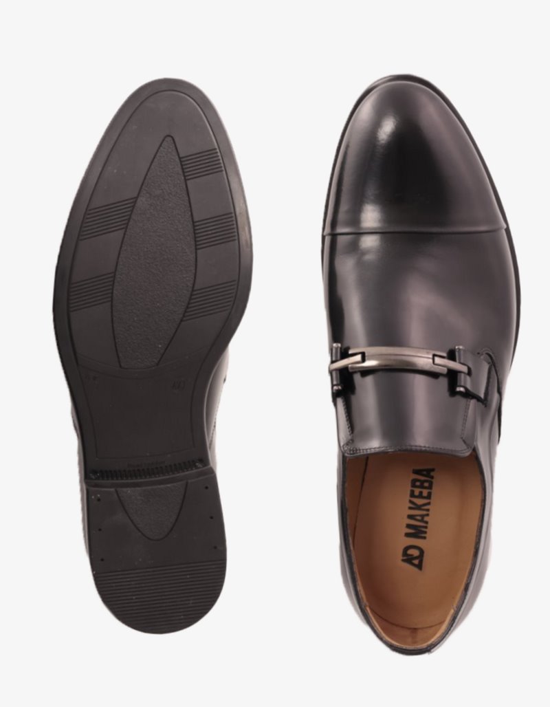 Chaussures en cuir noir, semelles TR extralight et bracelet en acier.