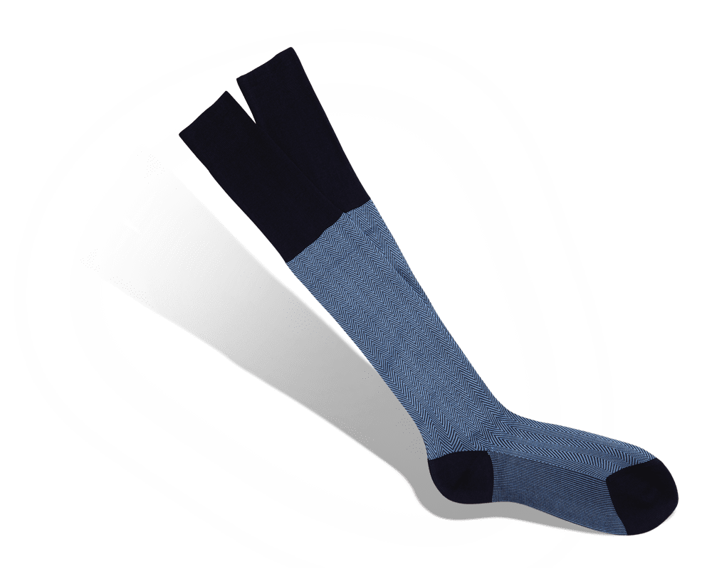 Chaussettes à chevrons bleu marine et bleu ciel, 100% fil d’Ecosse. Fabriqué en Italie.