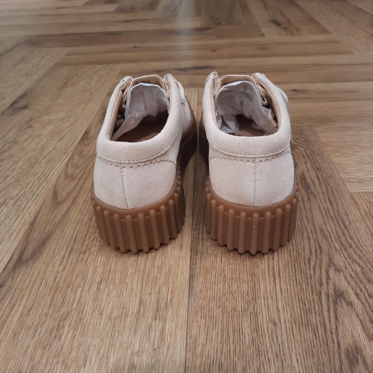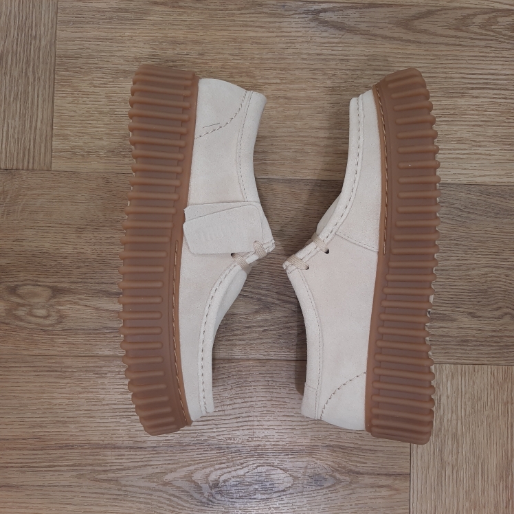 Empeigne en daim écru de qualité supérieure Les lacets ajustables offrent un ajustement sûr et personnalisé La semelle intérieure amovible et moulée en cuir Contour Cushion soutient chaque pas Semelle extérieure durable en TR (caoutchouc thermoplastique) avec remplissage EVA offrant une traction légère Livré avec deux breloques en relief (logo Clarks et Torhill) pour rendre hommage à l’héritage de Clarks Hauteur du talon : 40mm