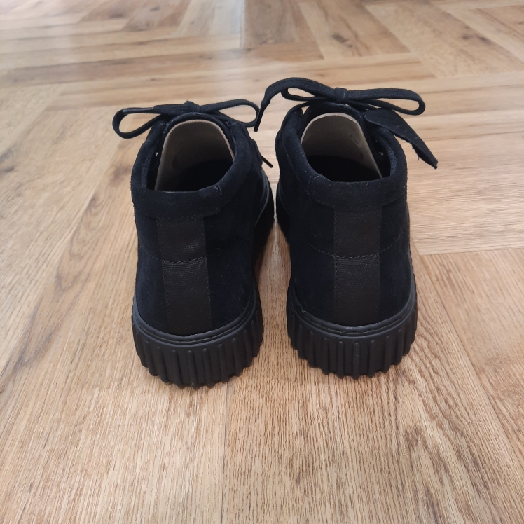 Tige en daim noir provenant de sources responsables Lacets réglables pour un ajustement sûr Doublure de l’assise plantaire en cuir souple et respirant La semelle Contour Cushion amovible, moulée et partiellement recyclée accompagnera chacun de vos pas Semelle antidérapante et flexible en TPR (caoutchouc thermoplastique) Livré avec deux portes-logo gravés en creux