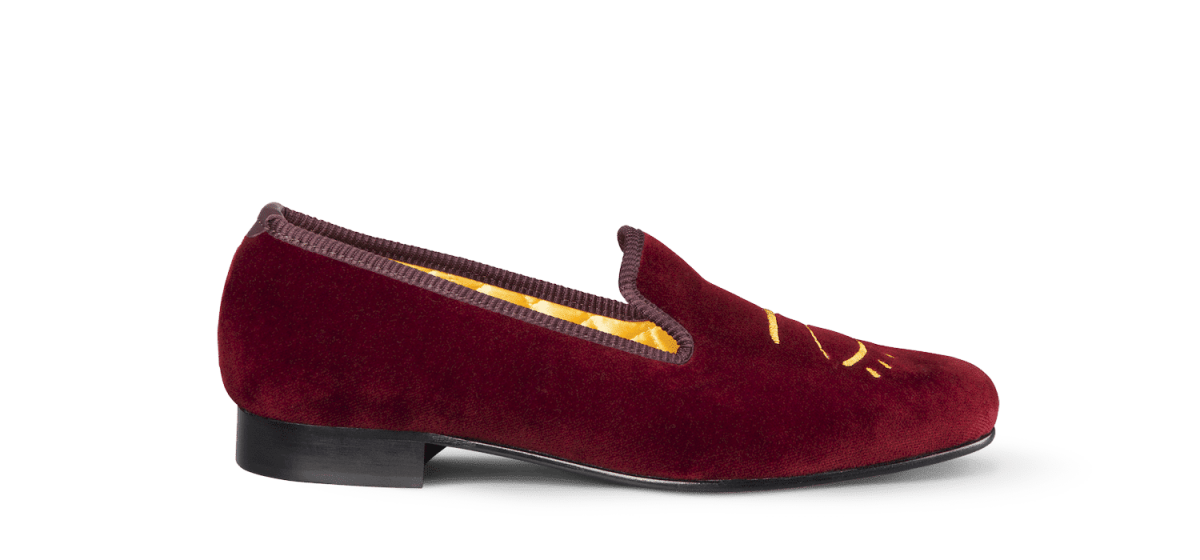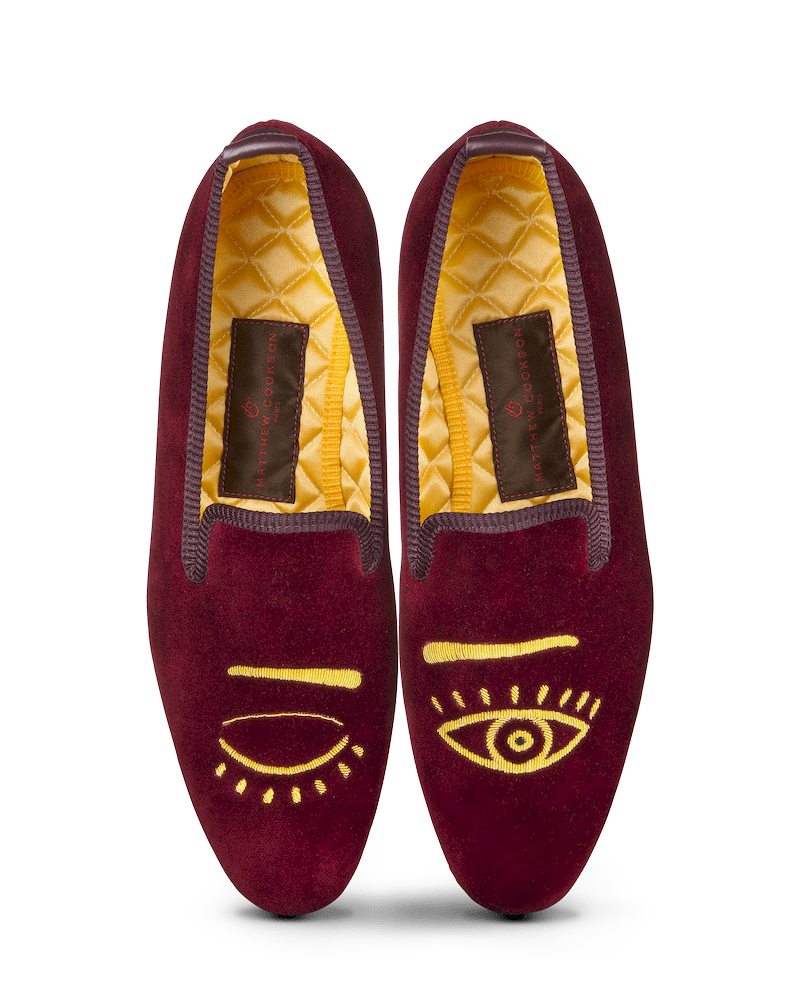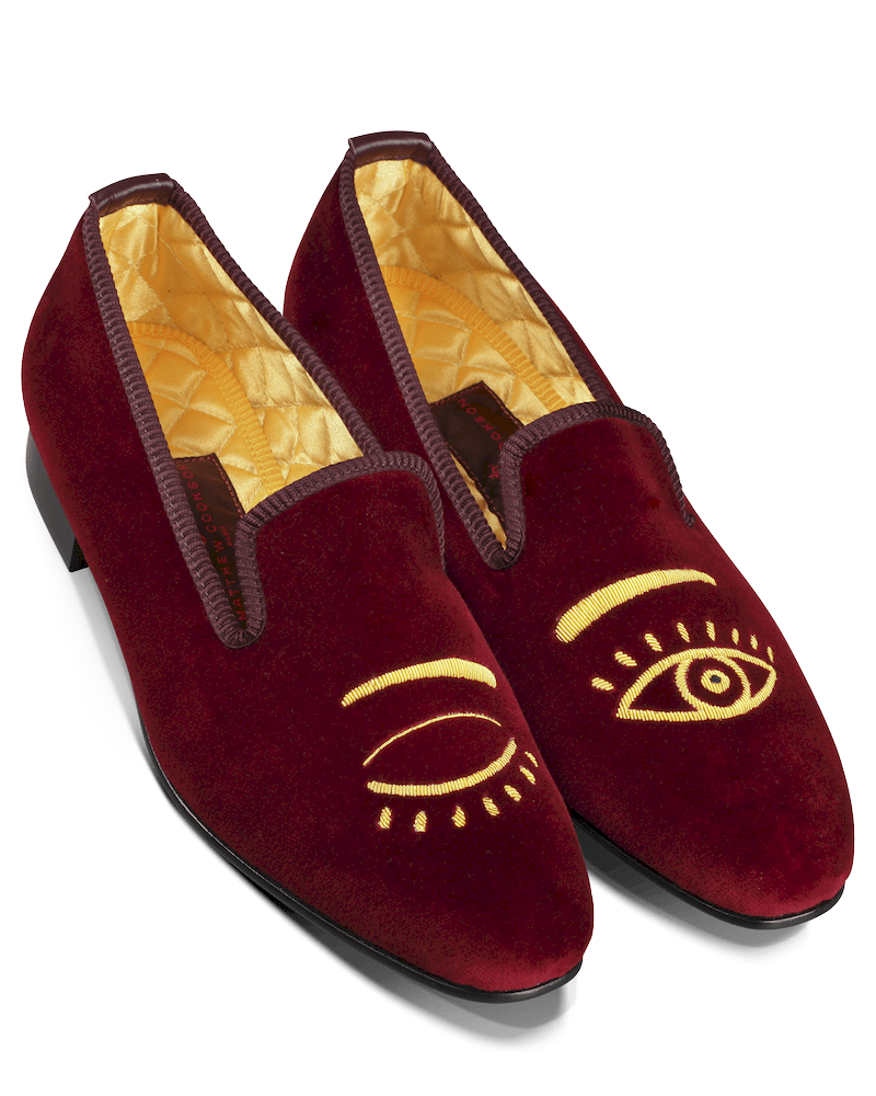 Les slippers clin d’oeil Matthew Cookson sont faites en velours de coton et brodées à la main, la doublure est en satin matelassé, le tout monté sur une fine semelle en cuir. Le summum de l’élégance et du confort.