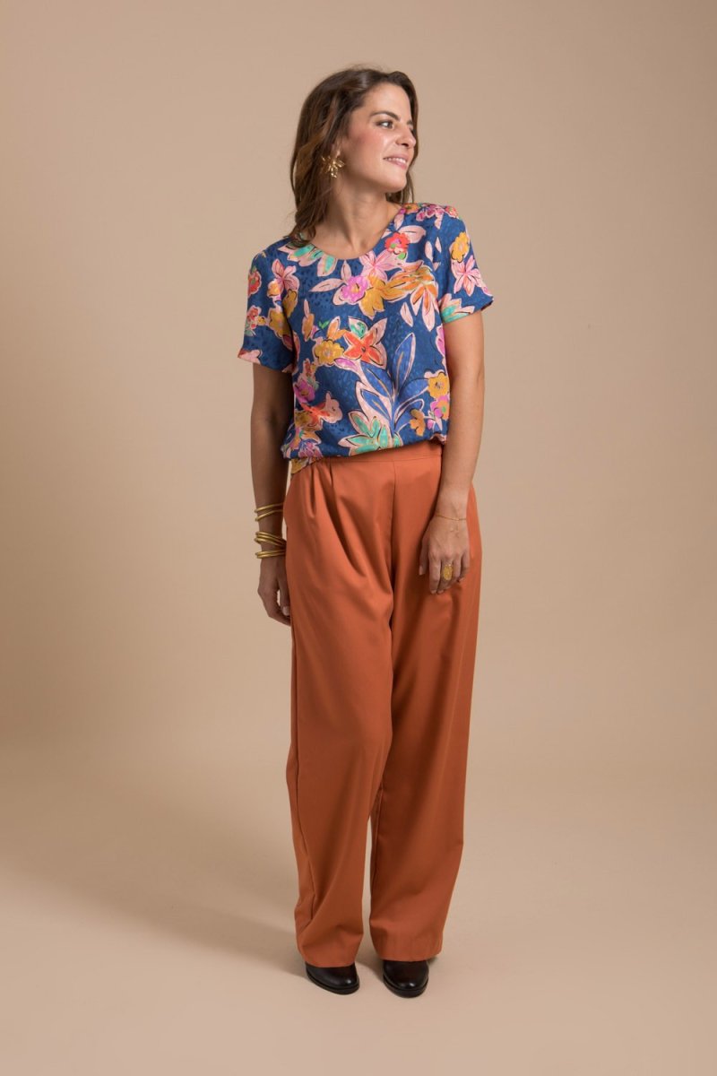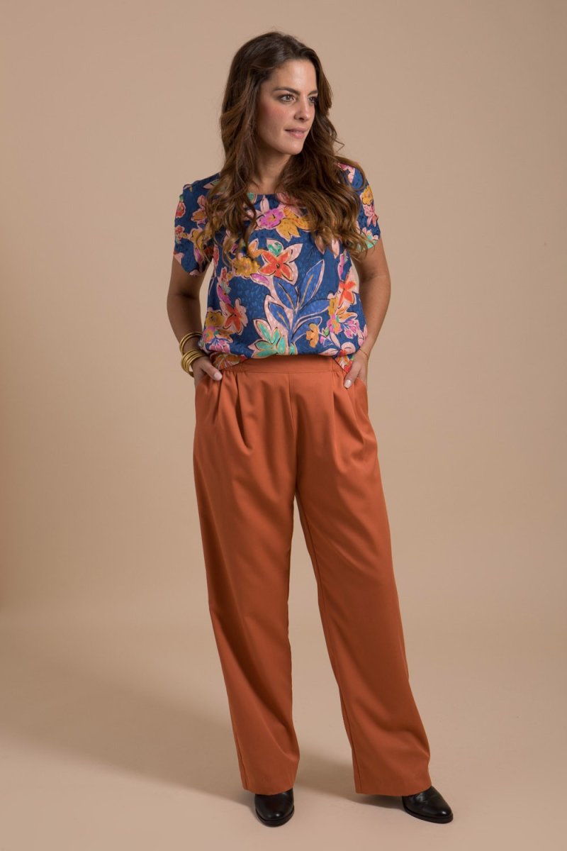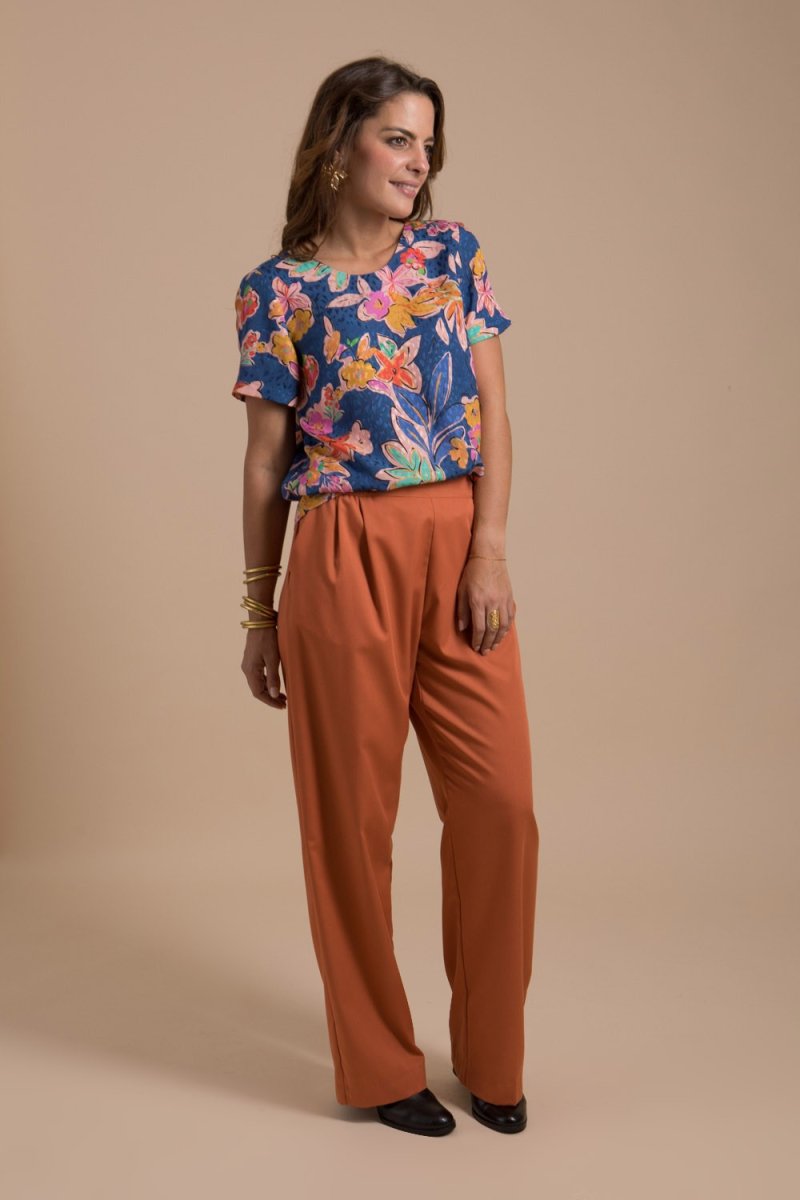 Pantalon femme confectionné dans un beau tissu aux couleurs automnales. Il donnera du style à vos looks d’automne grâce à sa coupe fluide et sa jolie couleur.