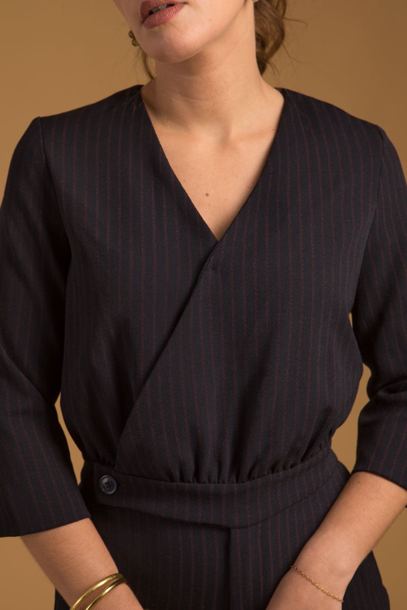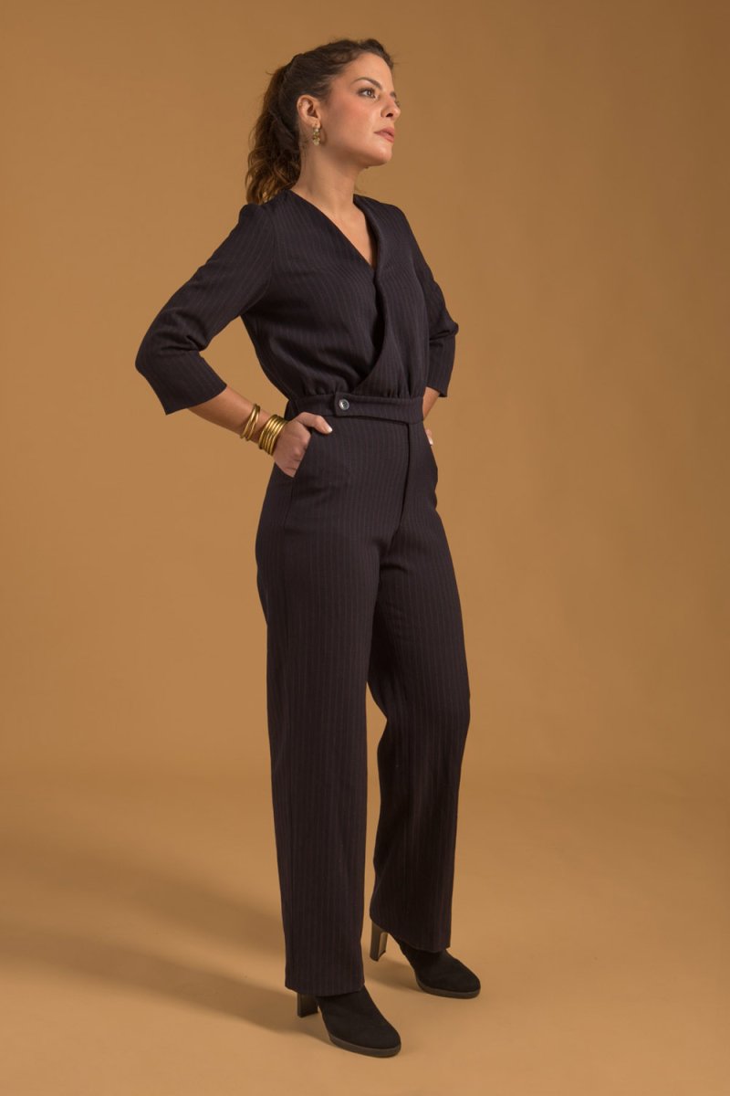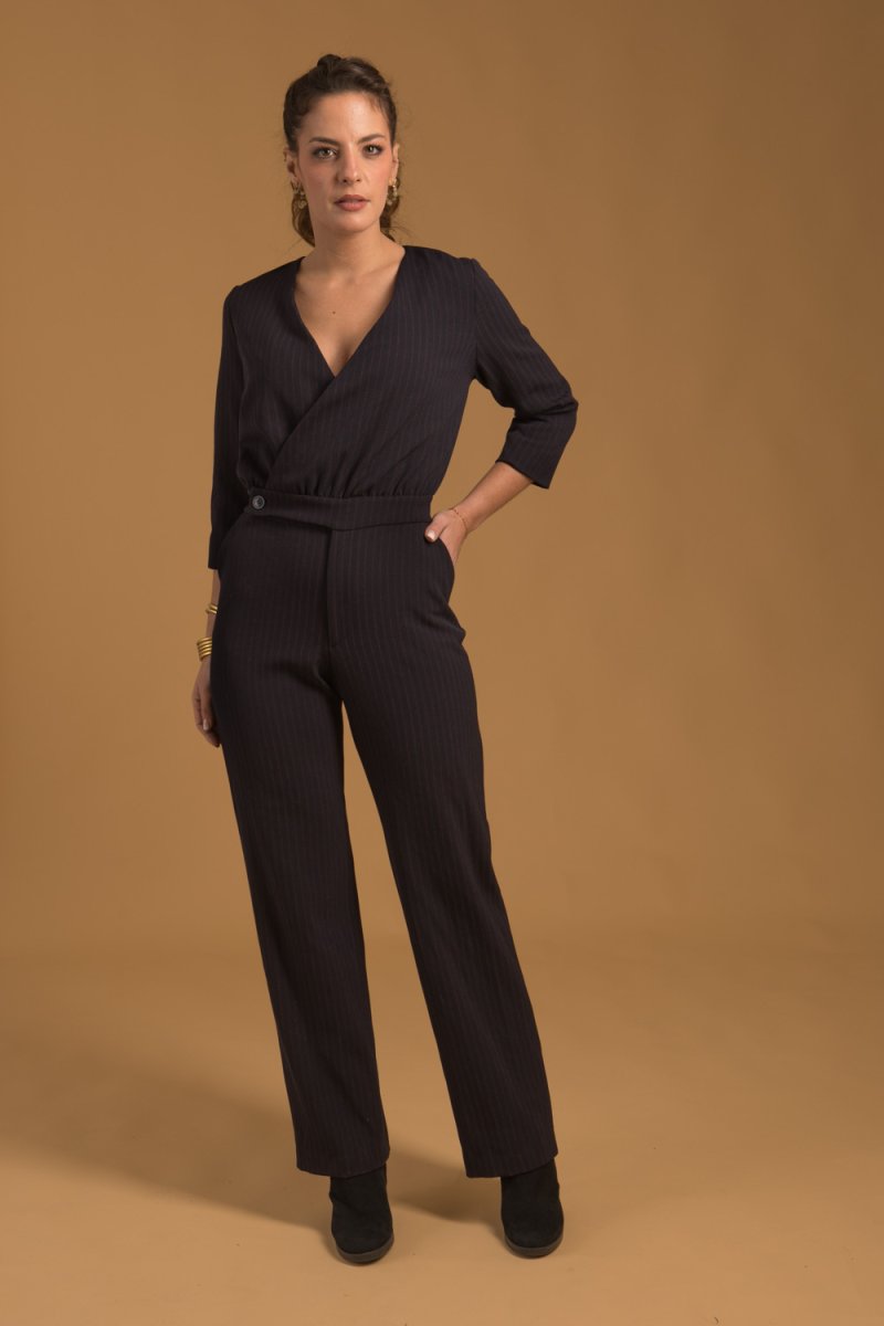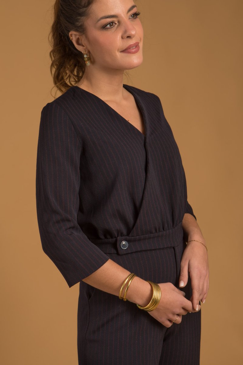 Cette combinaison bleu nuit à fines rayures pour femme, confectionnée dans un tissu 100 % Français.