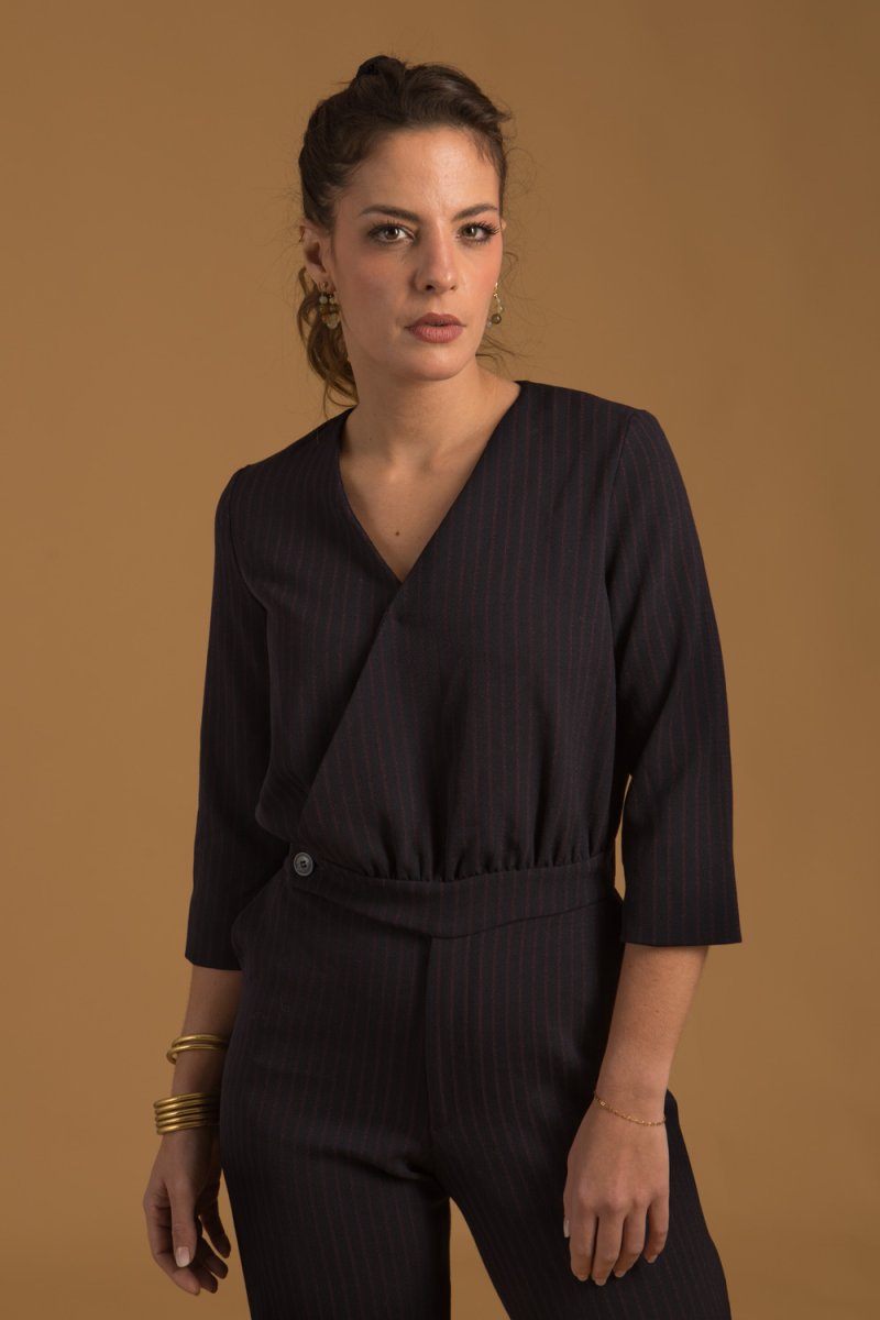 Cette combinaison à fines rayures pour femme est confectionnée dans un tissu 100% Français. Créée et fabriquée dans notre propre atelier à Montpellier.