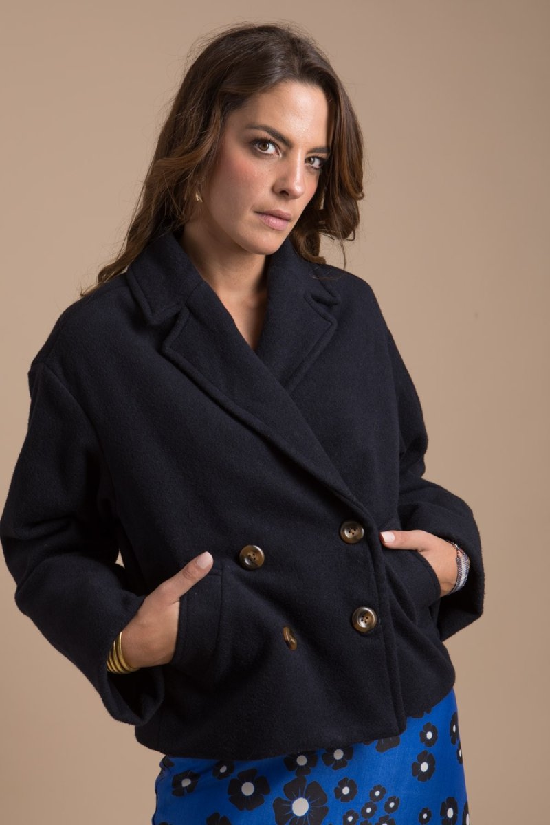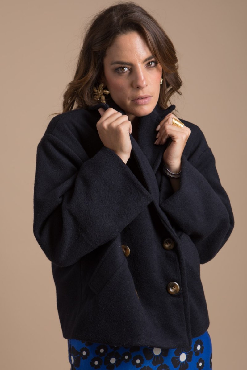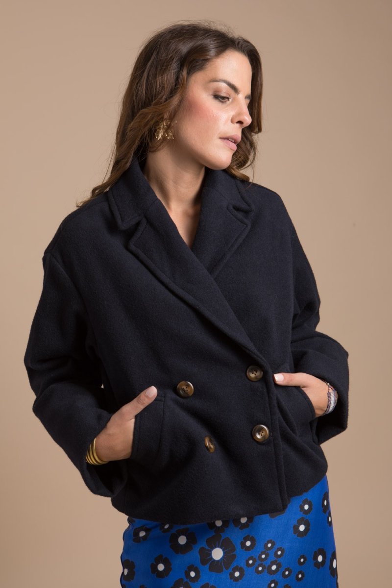 Sa forme oversize, ses jolies manches légèrement évasées sa belle couleur bleu nuit et sa longueur courte offrent un look sport-chic et facile à associer.