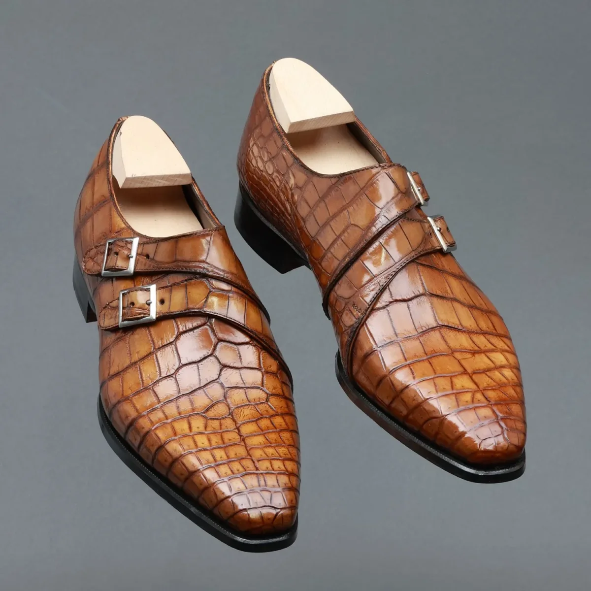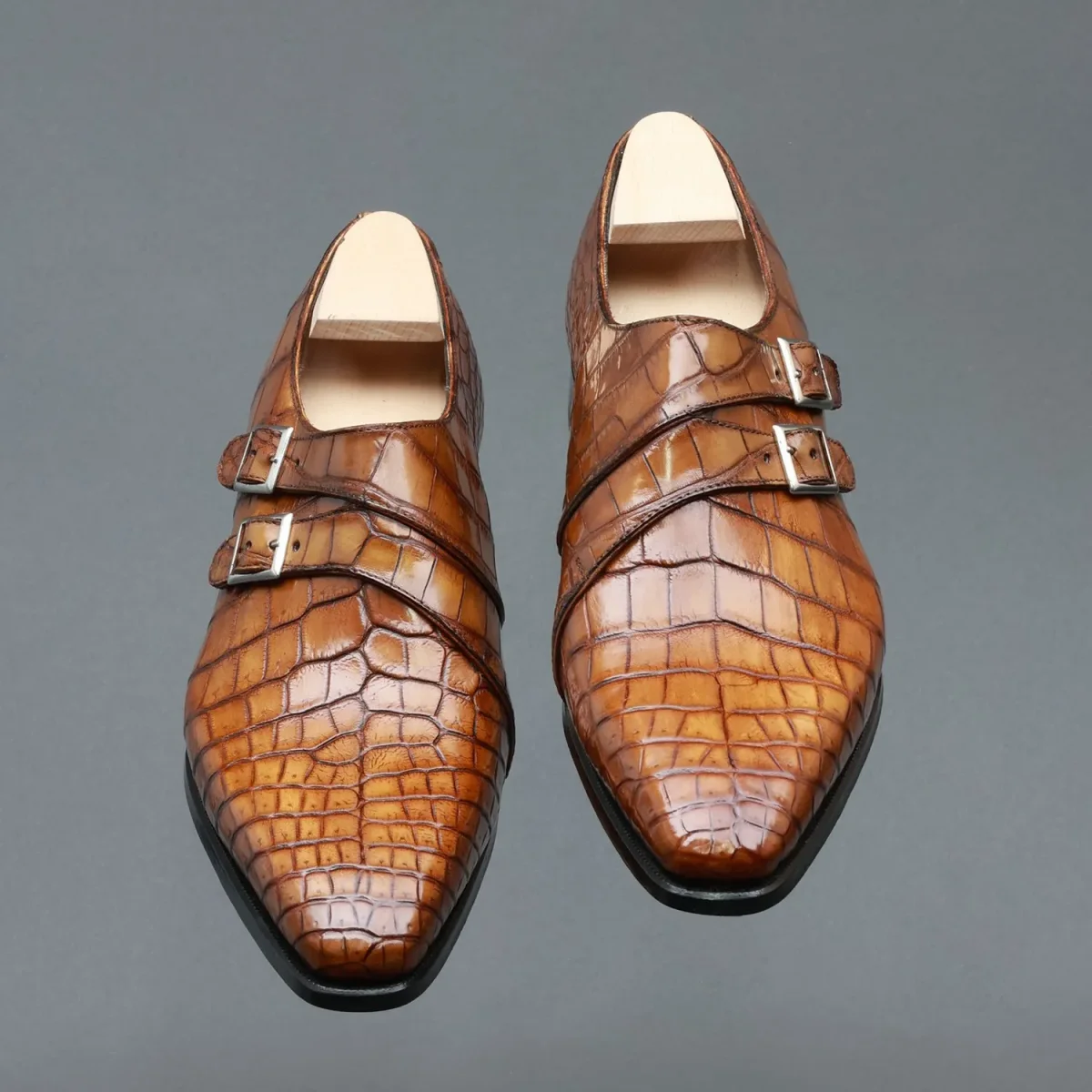 Le Derby à double boucle Alexandre propose de revisiter ce très emblématique modèle du vestiaire masculin : Le Double Boucle ou “Double Monk Strap”. Il se présente ici avec un système de boucle en “enveloppe” qui offre une ligne plus moderne et contemporaine au très british Double Boucle. Présenté ici dans un cuir de crocodile marron GOLD.