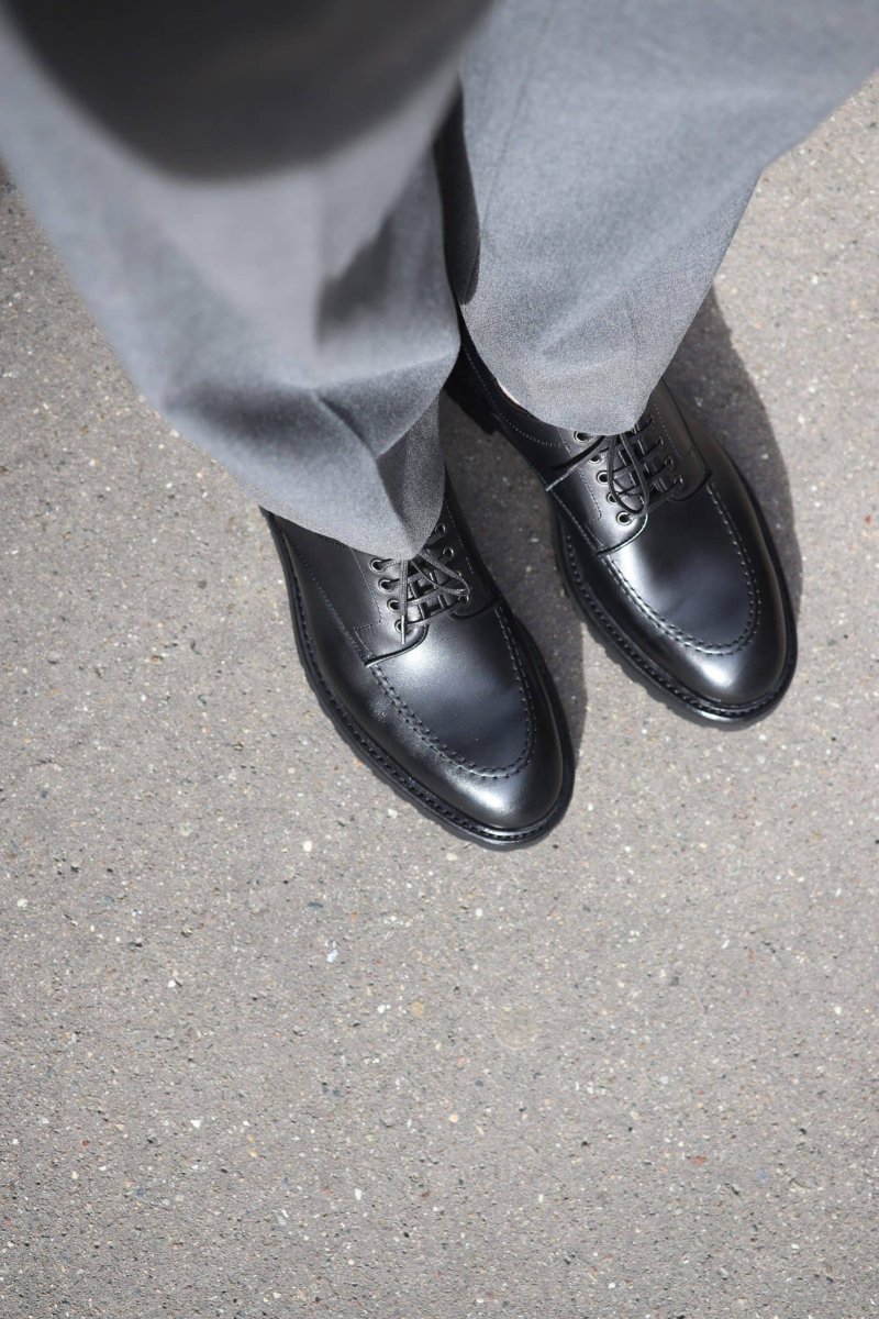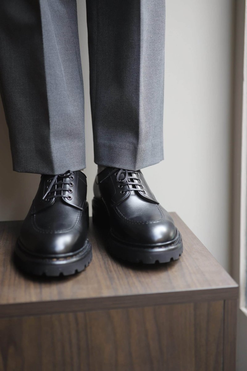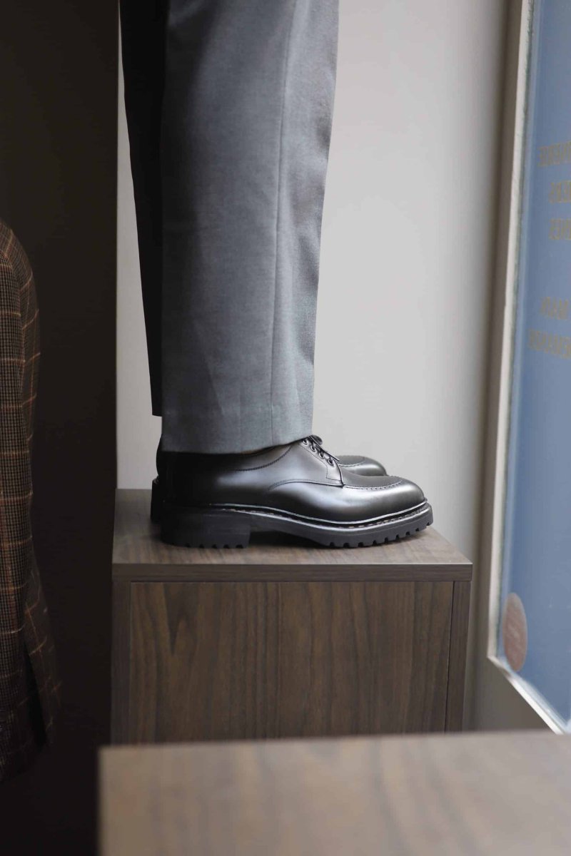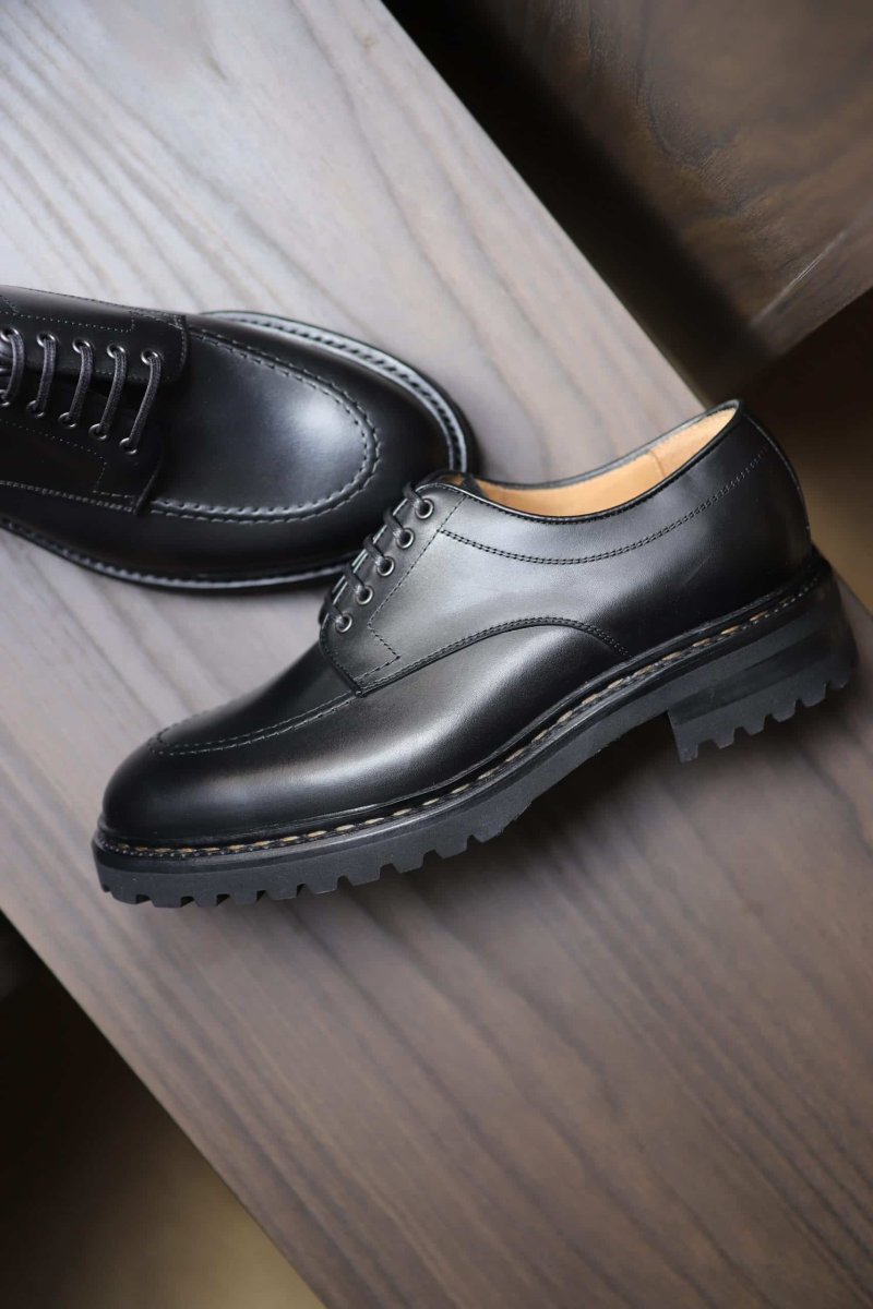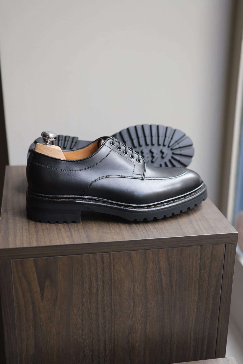 Friends, our “Defender” derby 5 eyelet microcellular commando sole is a beast. Beware. Mounted on a spectacularly outsized commando sole, topped with a black leather it’s held on a tight leash : a nowegian welt. It is quite… robust. A shoe designed for extreme and hostile conditions. But it will also do fine in urban conditions. Powerful yet graceful it perfectly acclimates to cities, thanks to its streamlined look. Whether around the Mont-Blanc or walking down the street the “Defender” is all about comfort while giving you a hightened point of view on things. Extra-thick-extra-soft…