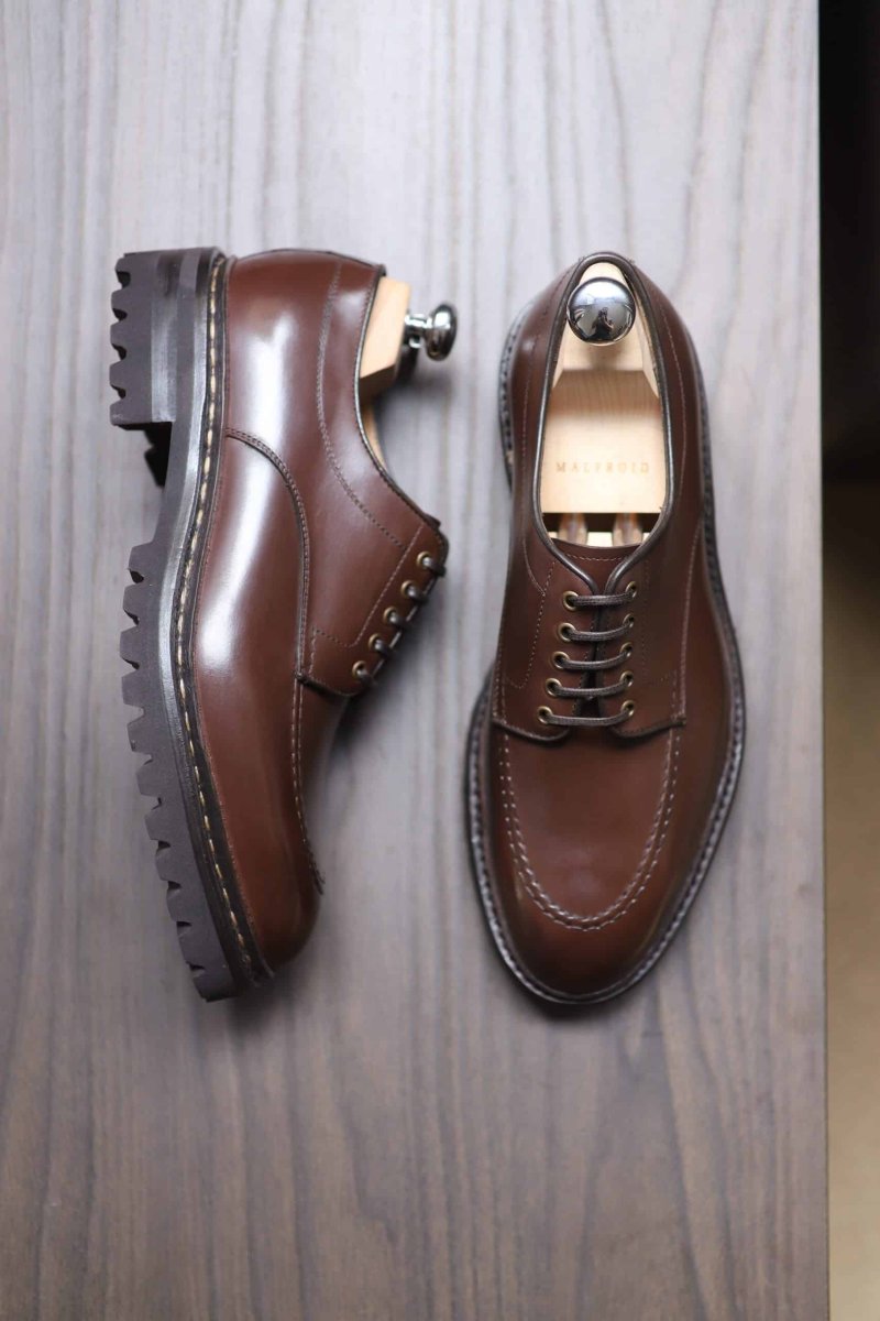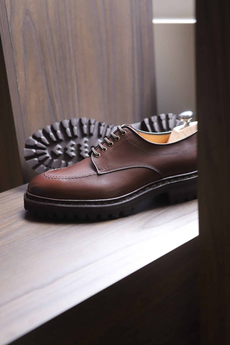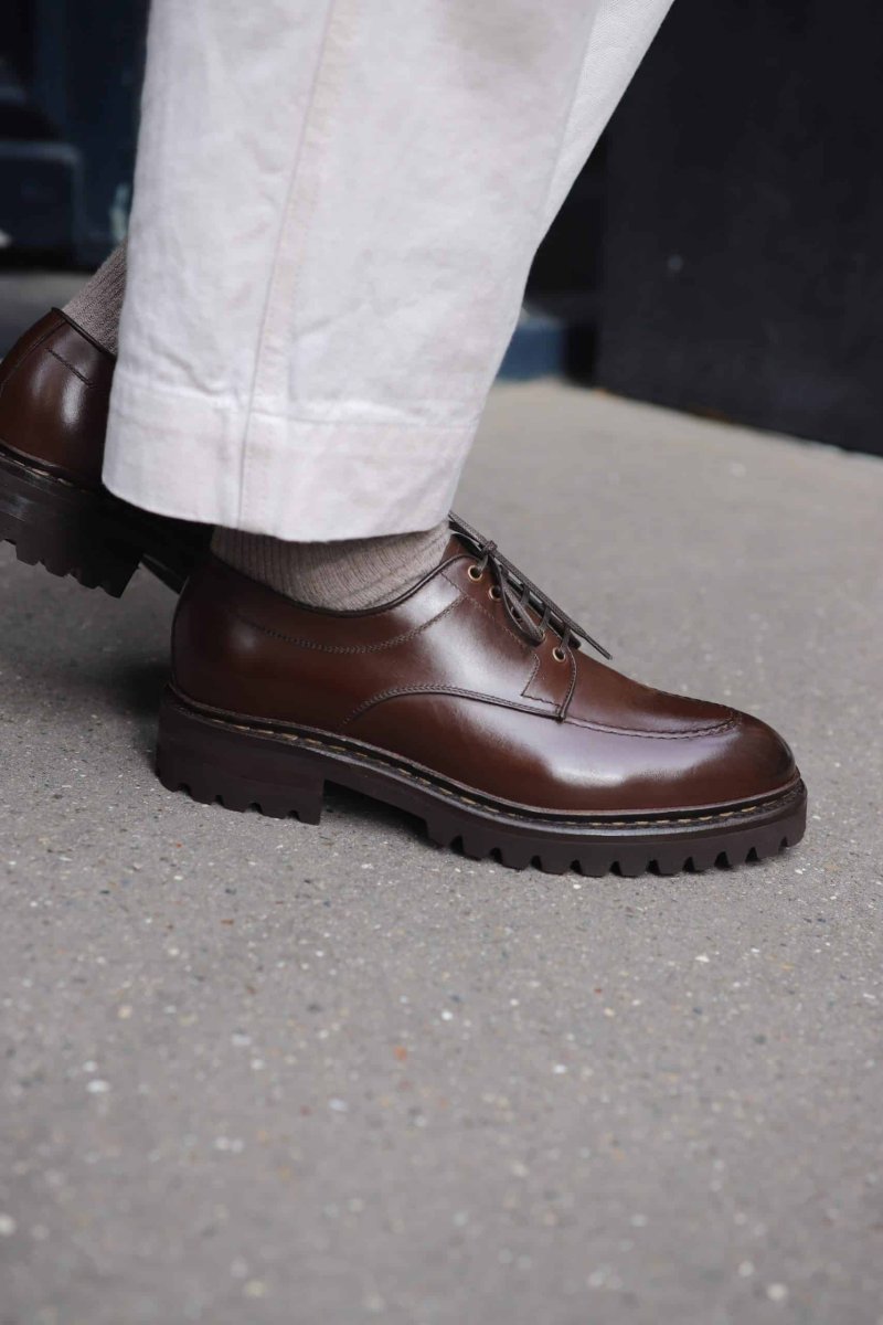Le cousu norvégien donne de l’allure et une formidable solidité structurelle, la trépointe marron foncée se marie à merveille avec le cuir marron moyen.