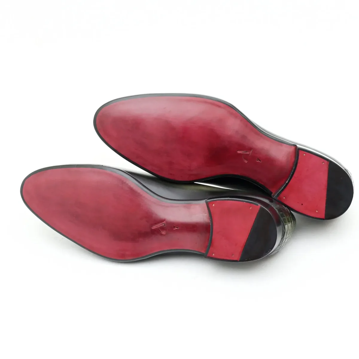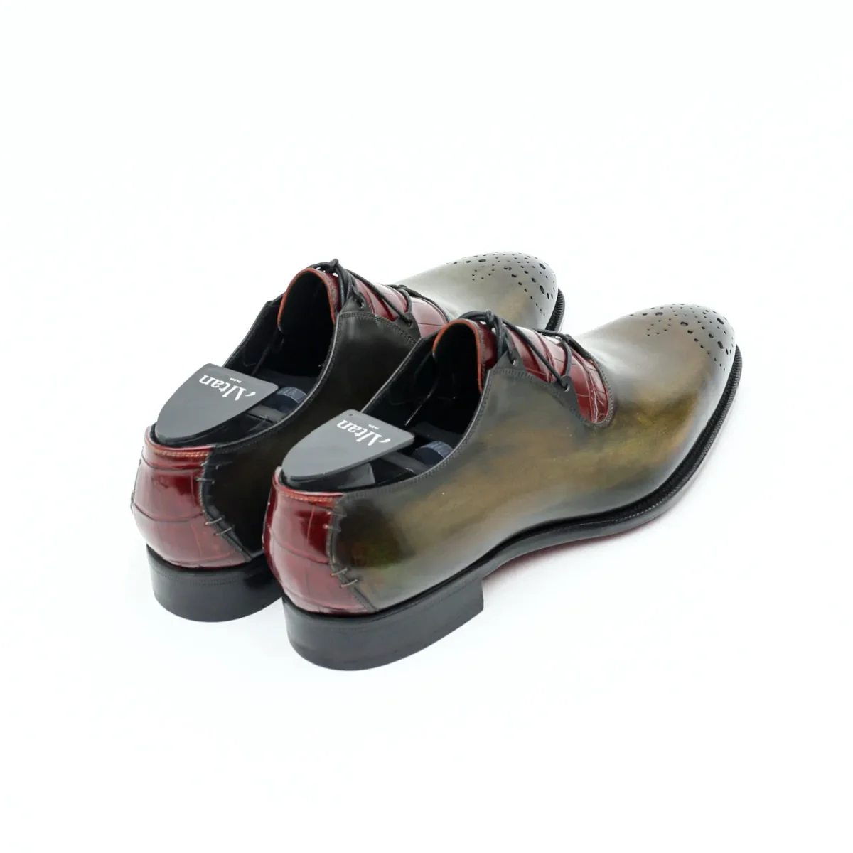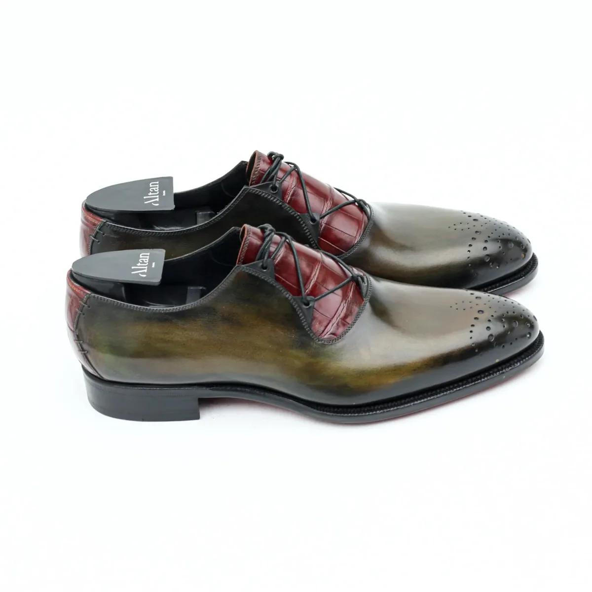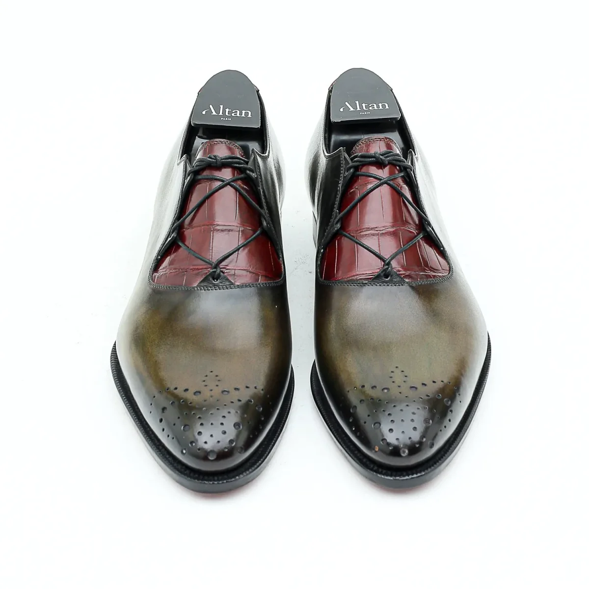 Le Casanova est un soulier de type derby à laçage Ghillie et bouts fleuris. Monté sur notre forme Goodyear Millenium c’est un modèle sophistiqué et unique. En box de tannage végétale la patine est à la carte. Présenté ici dans une patine une version bi-matière en cuir de veau et Alligator à patiner. Patine Vert Bronze.
