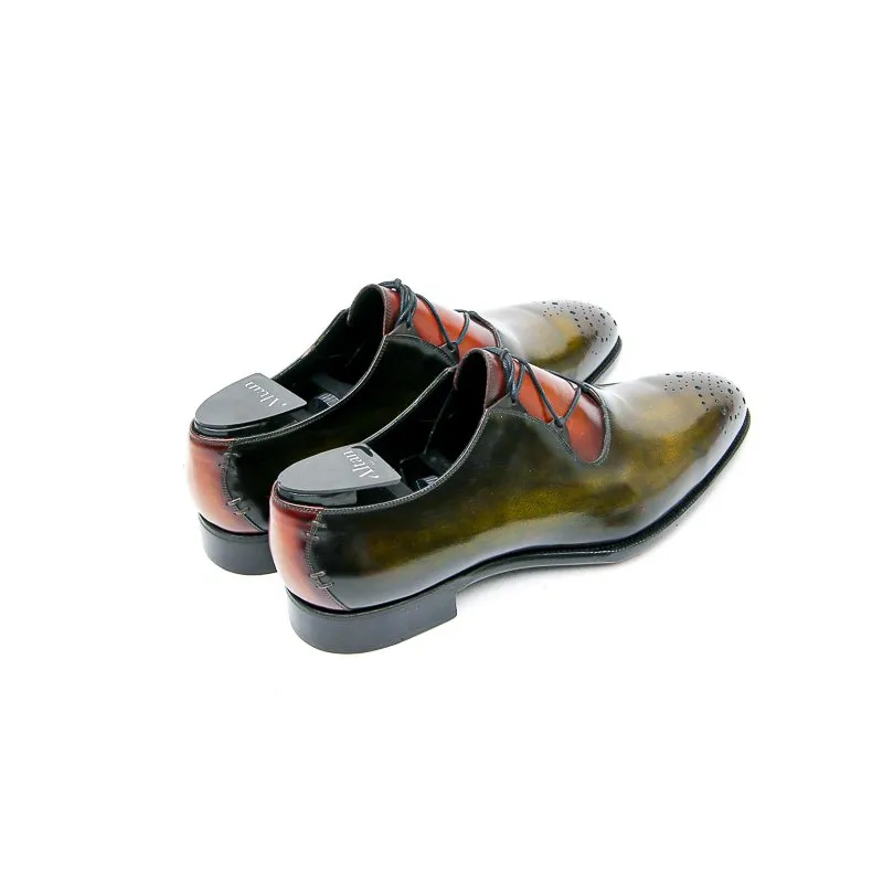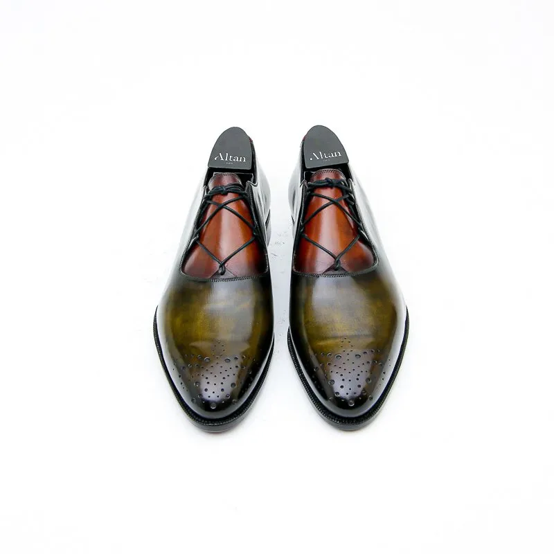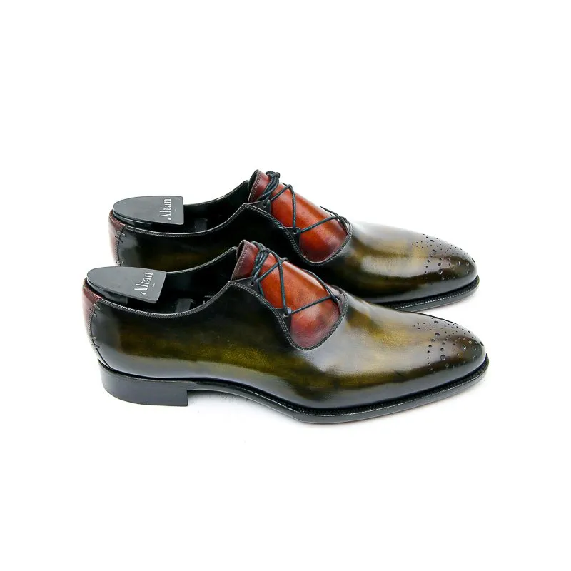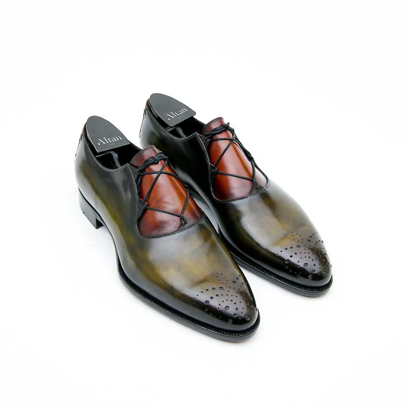 Le Casanova est un soulier de type derby à laçage Ghillie et bouts fleuris. Monté sur notre forme Goodyear Millenium c’est un modèle sophistiqué et unique. En box de tannage végétale la patine est à la carte. Présenté ici dans une patine Bi-colore Vert Bronze et Fauve.