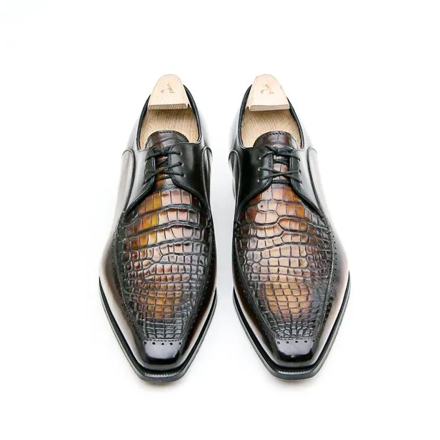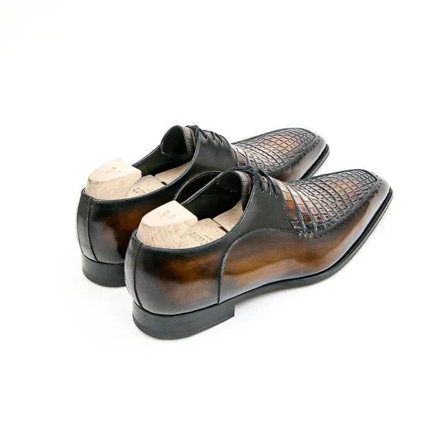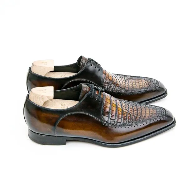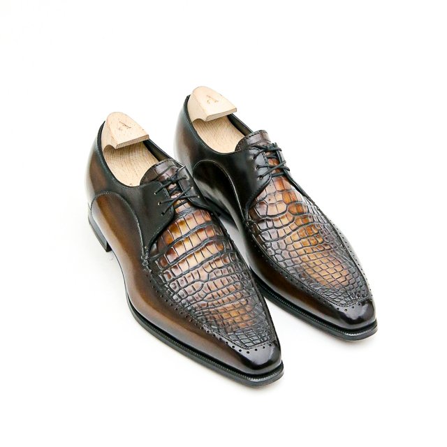 Ce Derby à trois œillets à plateau est monté sur notre forme Stop aux flancs marqués et à l’allure élancée. Son bout est un carré étroitisé donnant une certaine élégance très « dandy » à ce derby. C’est ici une version bi-matière avec le plateau en alligator. Présenté dans une patine marron caramel.