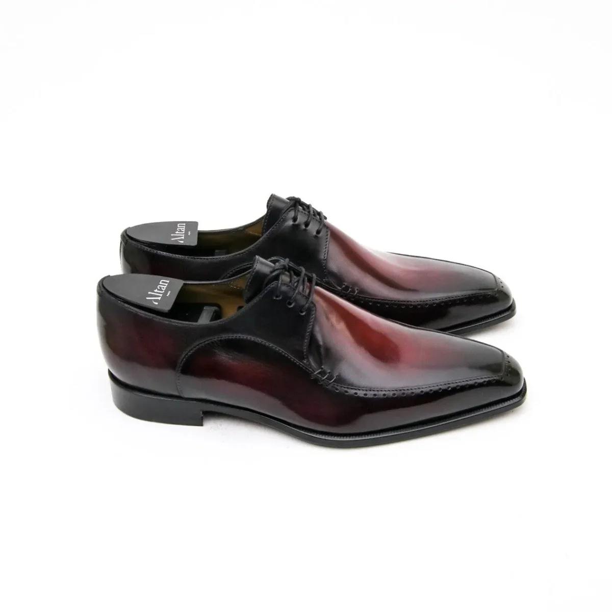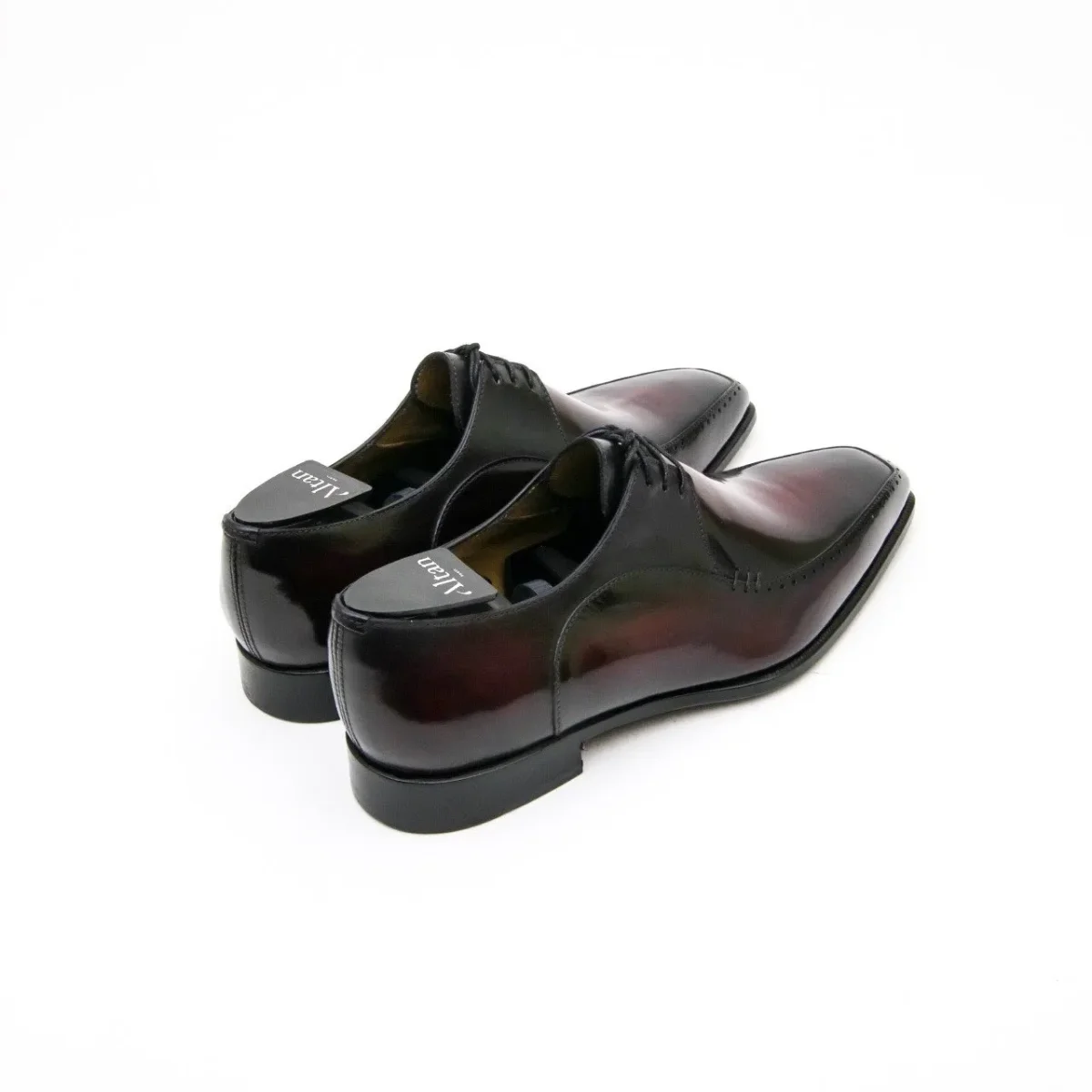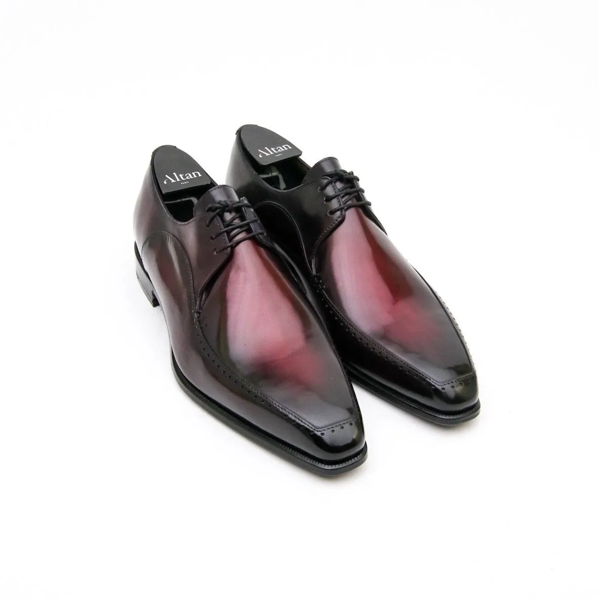 Ce Derby à trois œillets à plateau est monté sur notre forme Stop aux flancs marqués et à l’allure élancée. Son bout est un carré étroitisé donnant une certaine élégance très « dandy » à ce derby. Présenté ici dans une patine Bordeaux lie de vin des plus classique et efficace. Avant de faire votre choix n’hésitez pas à consulter notre « guide des tailles » et notre « guide des patines » Guide des tailles Guide des Patines