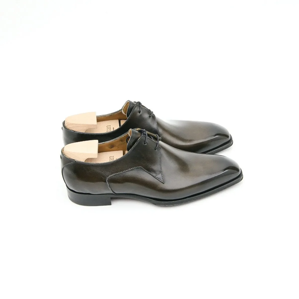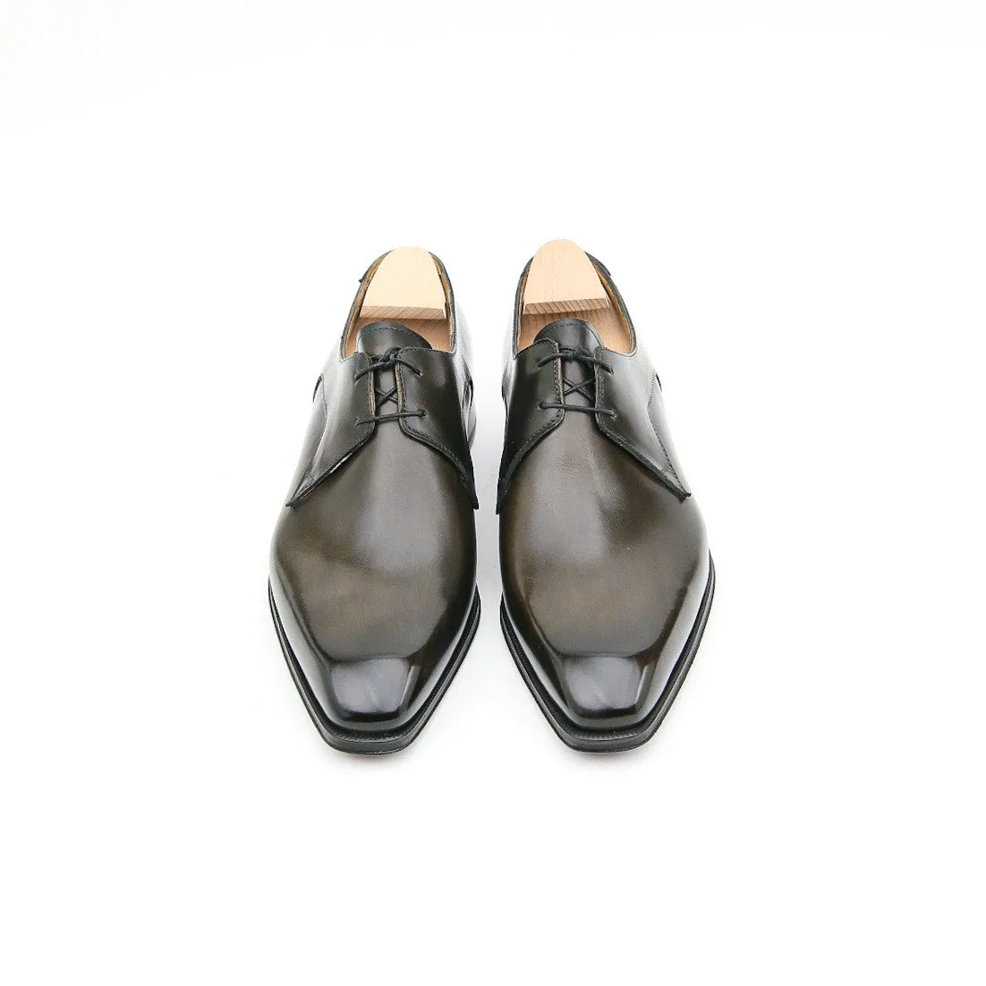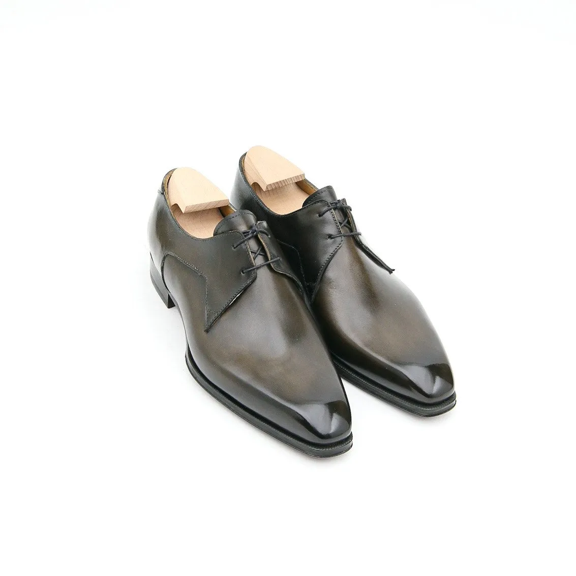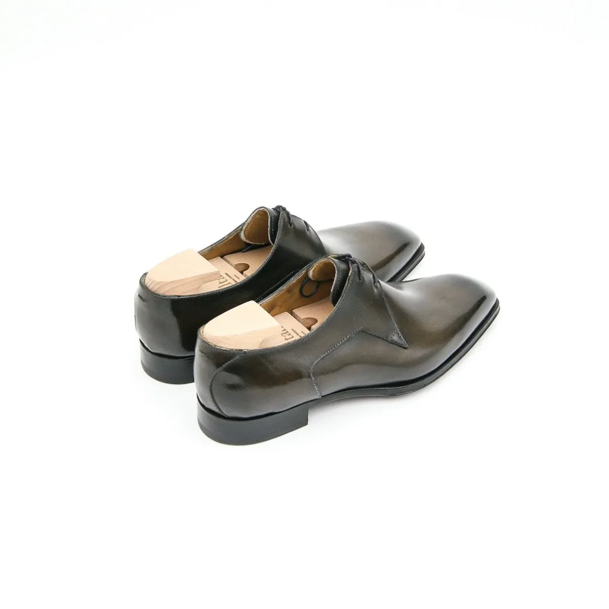 Ce modèle est la seconde version de notre emblématique derby « V » Front à deux œillets. Plus moderne par les cassures de lignes de ses garants, Le « V » Front 2 est un classique facile à porter. Monté sur notre forme Senzo à bout carré atténué légèrement « muflé ».