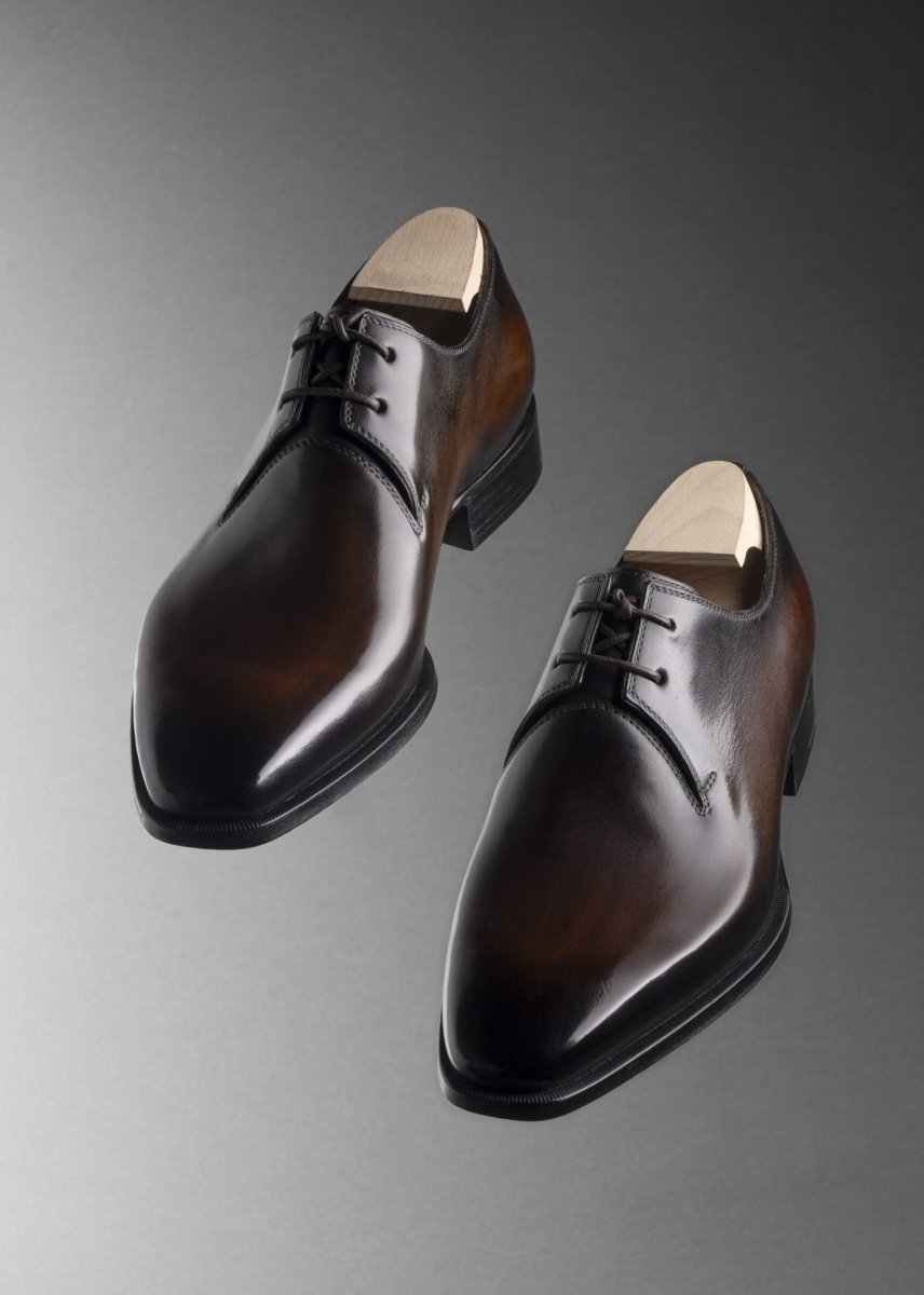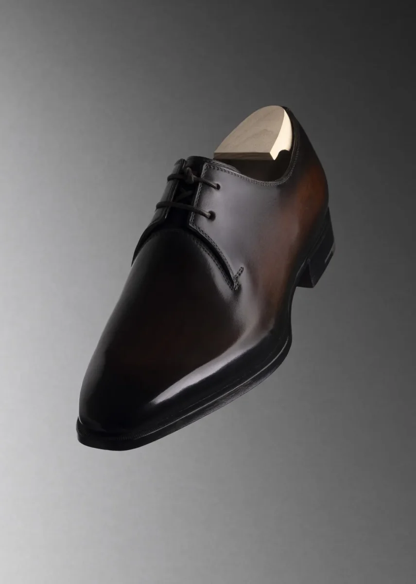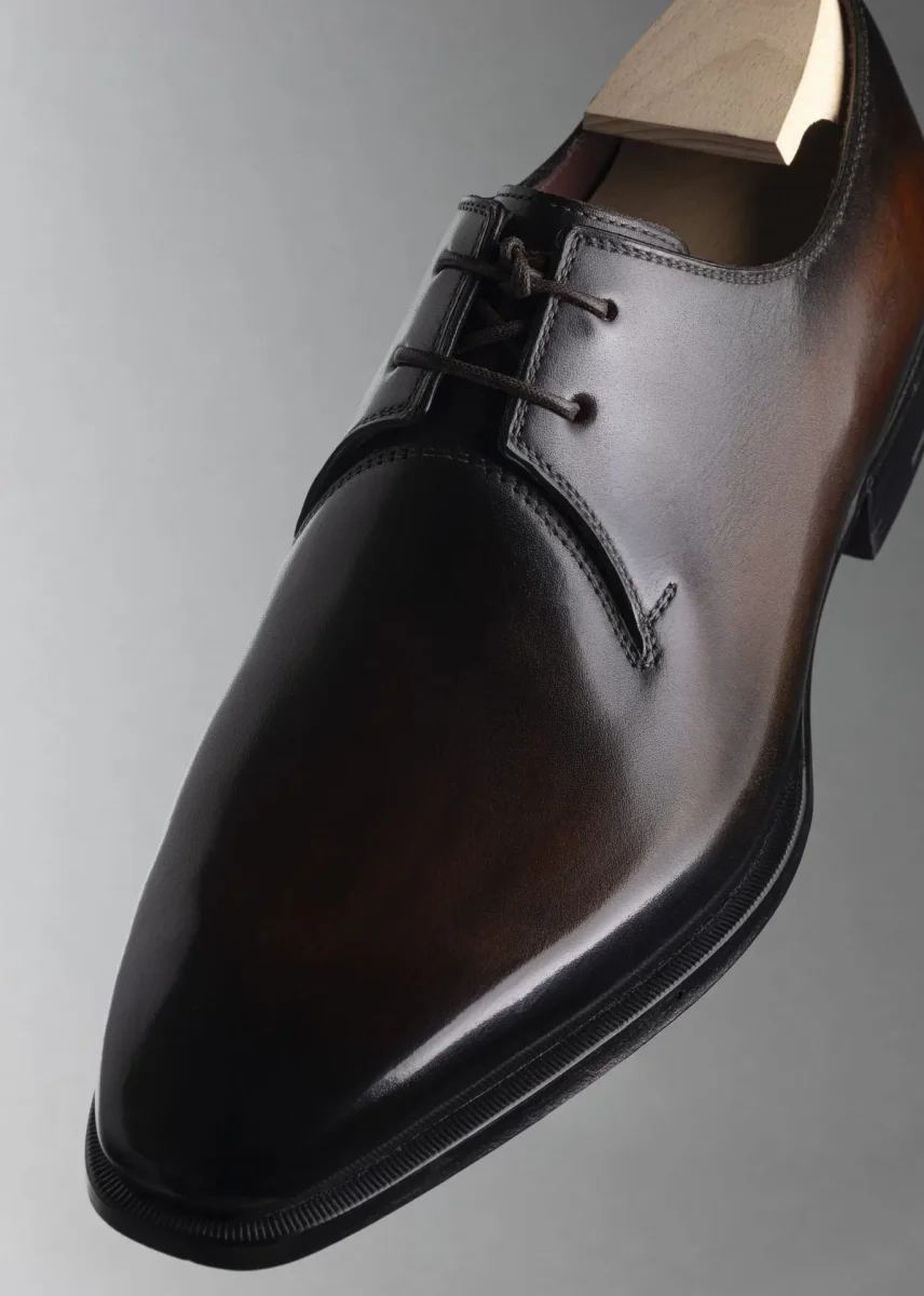 La patine met particulièrement en valeur la construction whole cut, car la continuité du cuir offre un terrain d’expression idéal aux jeux de nuances, de profondeur et de lumière.