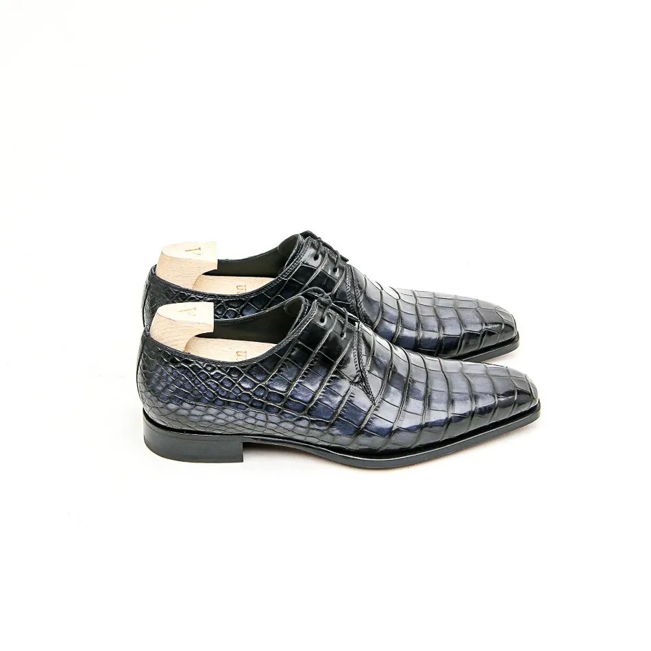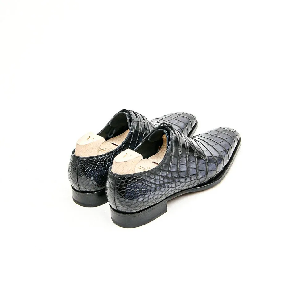 Ce derby a été réalisé en une seule pièce de cuir afin d’obtenir la même fluidité qu’avec un richelieu wholecut. L’idée étant ici d’épurer au maximum dans le but de mettre en valeur les lignes du modèle. La partie de la peausserie d’Alligator utilisée est ici le ventre, la plus noble. Deux bêtes sont donc nécessaires afin d’obtenir une homogénéité quasi parfaite entre les deux pieds.