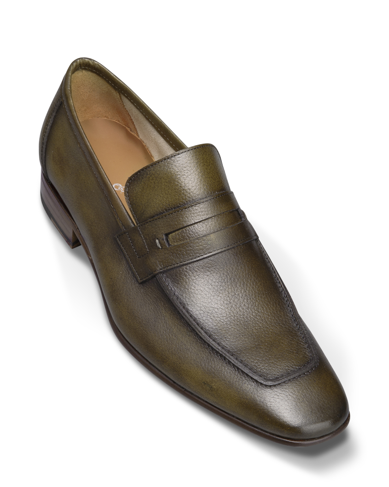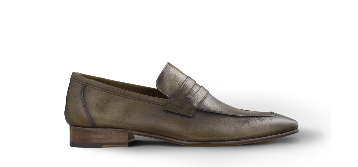 Mocassin non doublé en veau grainé bronze. Semelle en cuir et gomme. Cousu Blake.