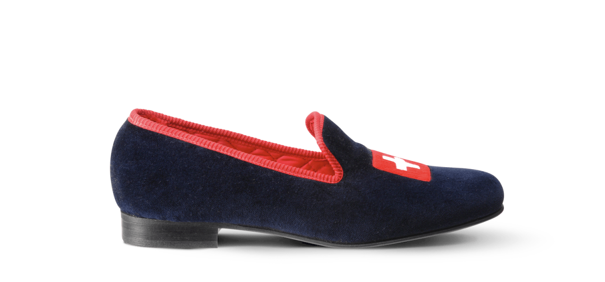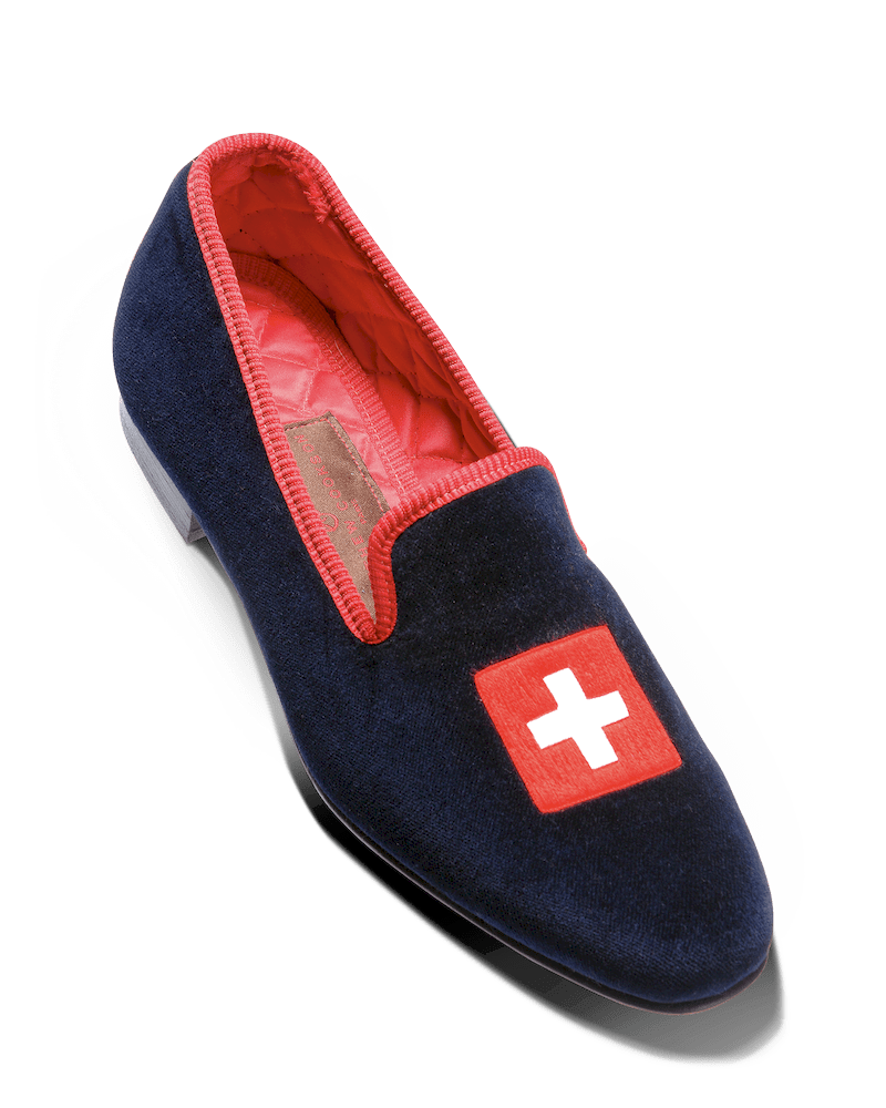 Les slippers drapeau suisse Matthew Cookson sont faites en velours de coton et brodées à la main, la doublure est en satin matelassé, le tout monté sur une fine semelle en cuir. Le summum de l’élégance et du confort.