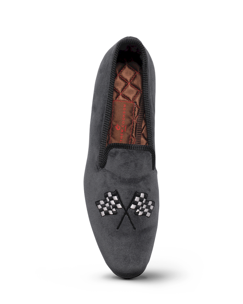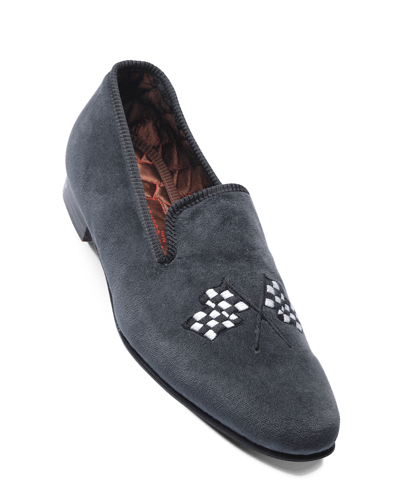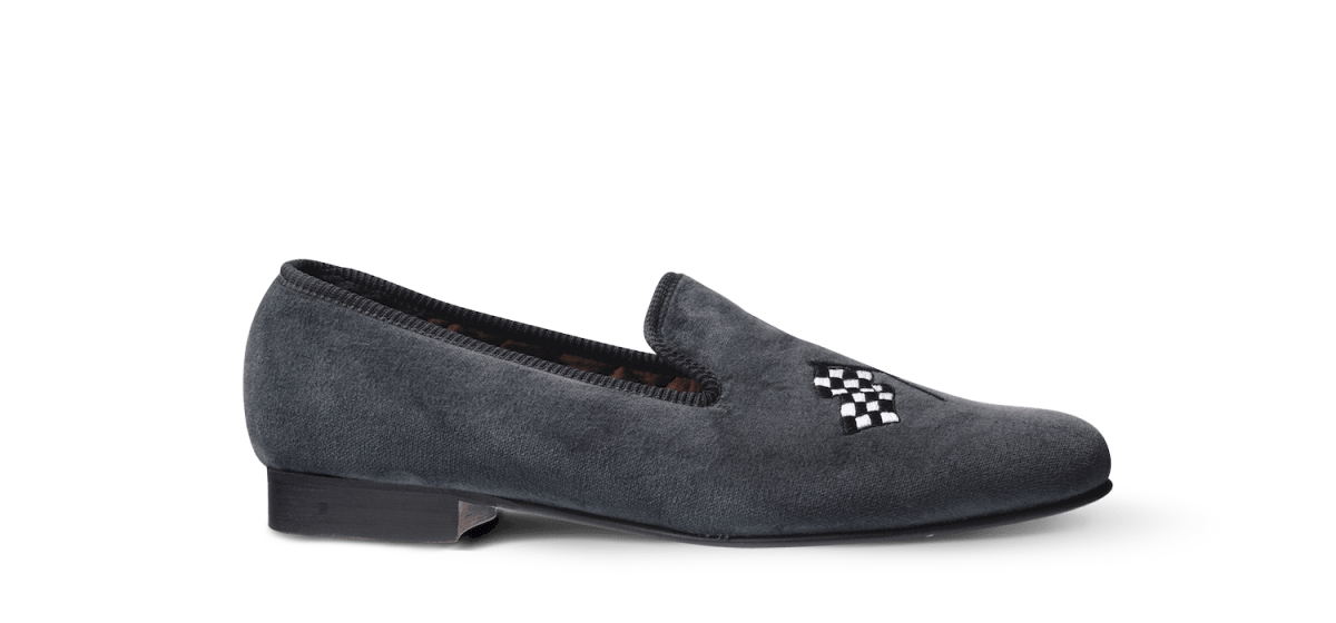 Les slippers drapeaux Matthew Cookson sont faites en velours de coton et brodées à la main, la doublure est en satin matelassé, le tout monté sur une fine semelle en cuir. Le summum de l’élégance et du confort.