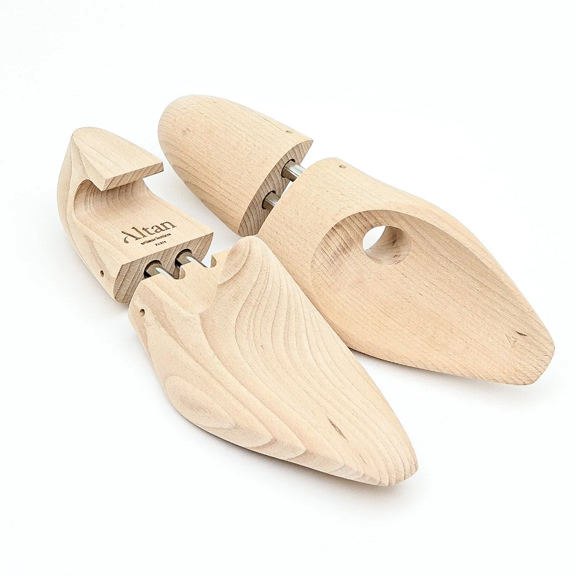 Les embauchoirs en bois Altan Bottier façonnés à la forme de montage du soulier sont indispensables pour la bonne tenue de vos souliers Altan. Fabriqués en bois de hêtre brut ils garantiront le maintien parfait de la forme de vos souliers, l’absorption de l’humidité et atténueront les plis de marche. Les embauchoirs Altan ont aussi la particularité d’être extrêmement légers et peuvent tout à fait être emmenés lors de vos voyages.