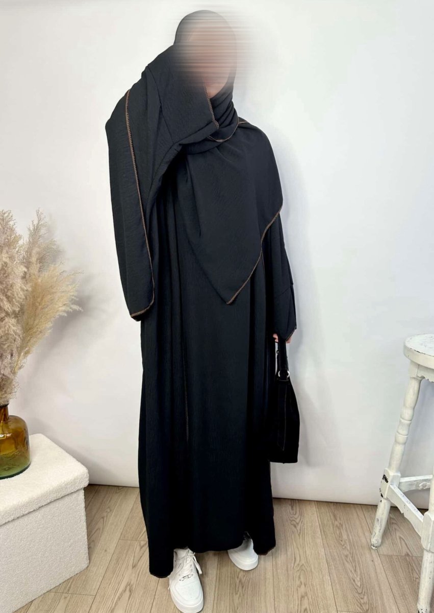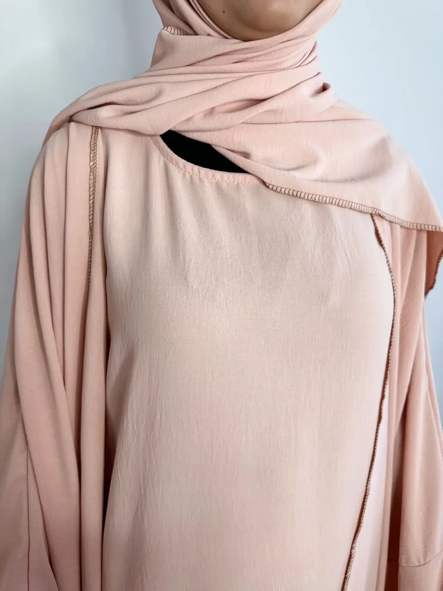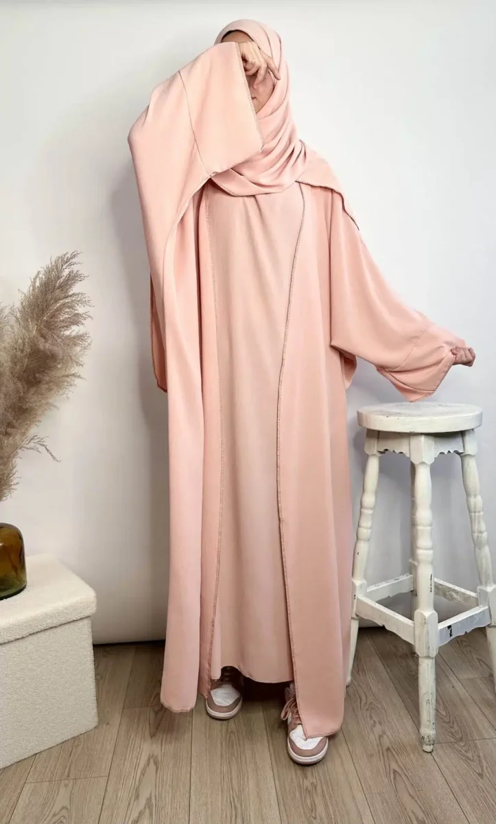 Découvrez l’Ensemble Jazz Mina 3 pièces. Une tenue complète pour femme musulmane en tissu Jazz haute qualité. Elle se compose d’un Kimono d’une sous-abaya et d’un Maxi Hijab. Cet ensemble aussi possède des coutures apparentes qui ajoute une touche d’originalité à l’ensemble abaya.
