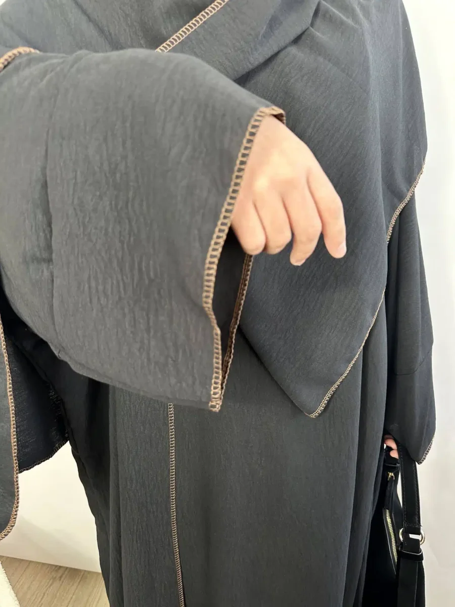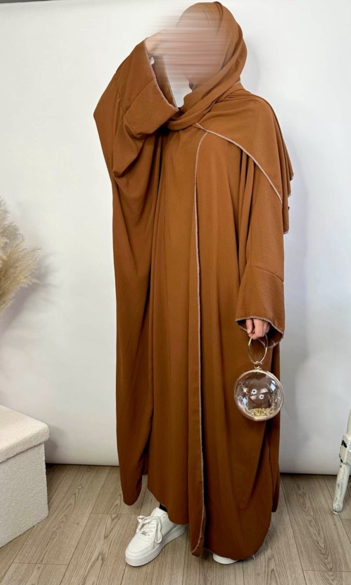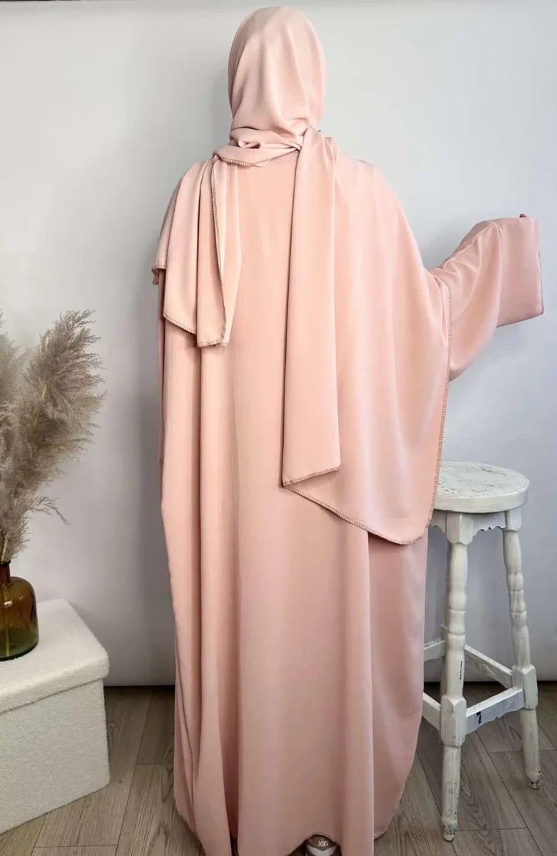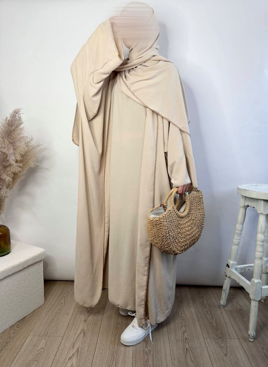 Découvrez l’Ensemble Jazz Mina 3 pièces. Une tenue complète pour femme musulmane en tissu Jazz haute qualité. Elle se compose d’un Kimono d’une sous-abaya et d’un Maxi Hijab. Cet ensemble aussi possède des coutures apparentes qui ajoute une touche d’originalité à l’ensemble abaya.