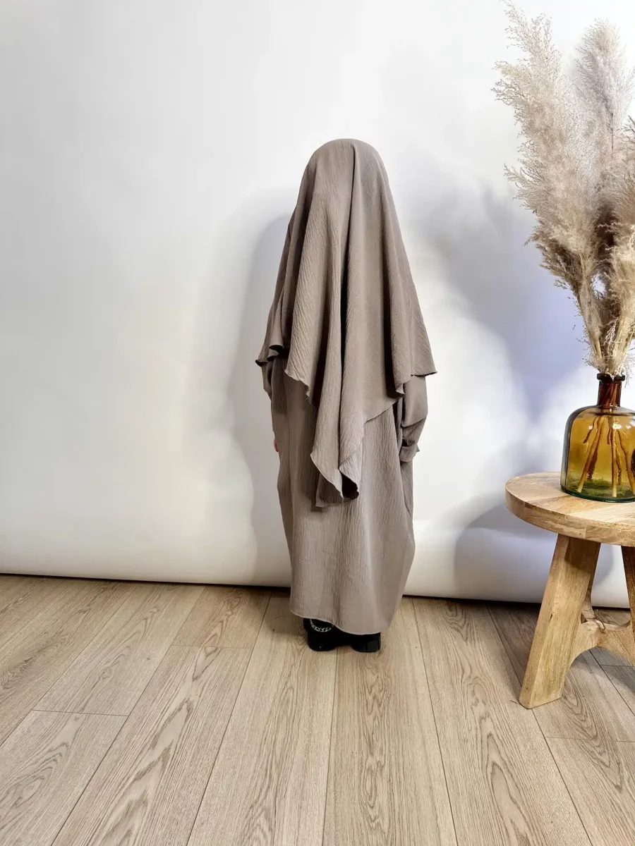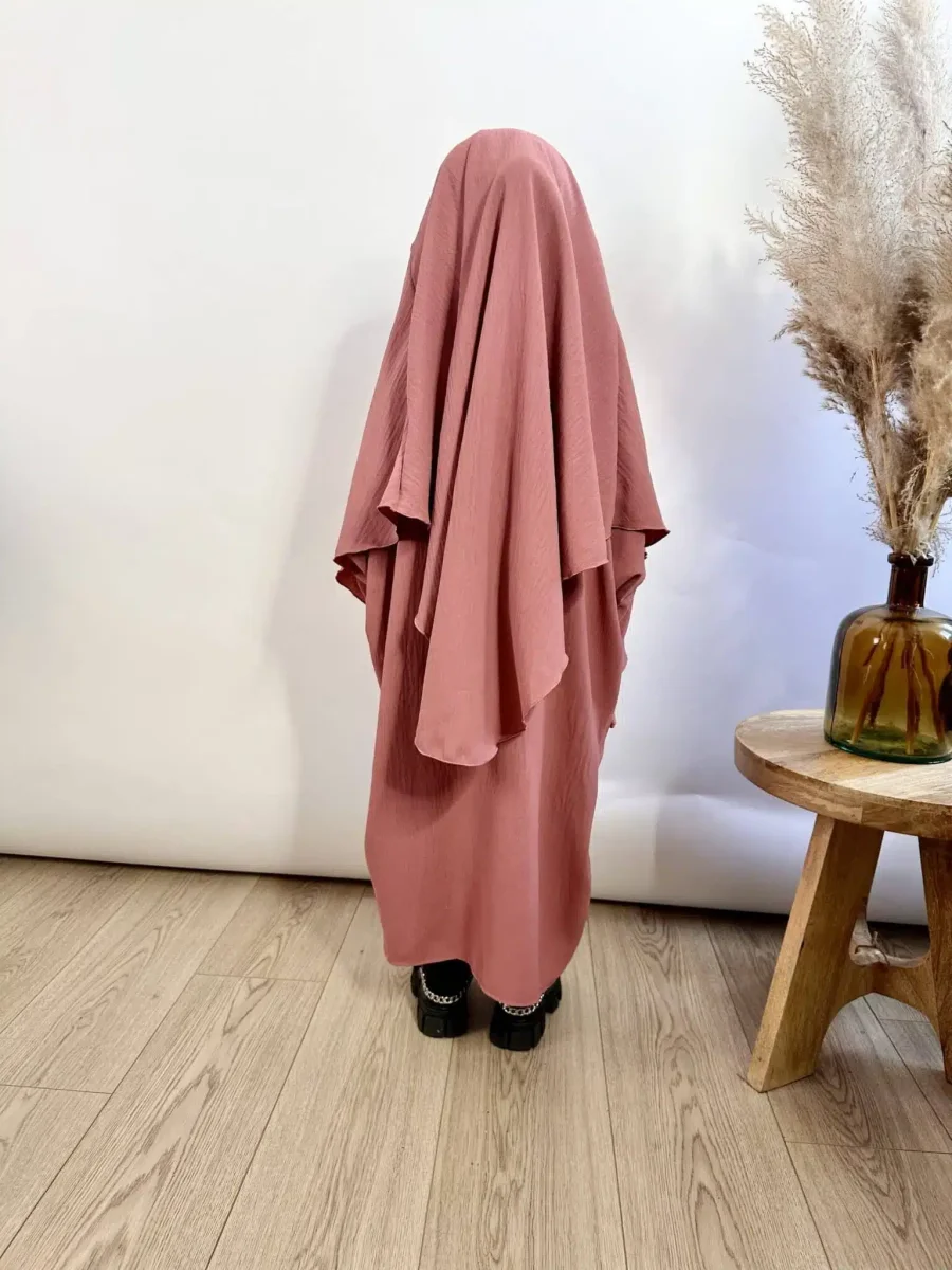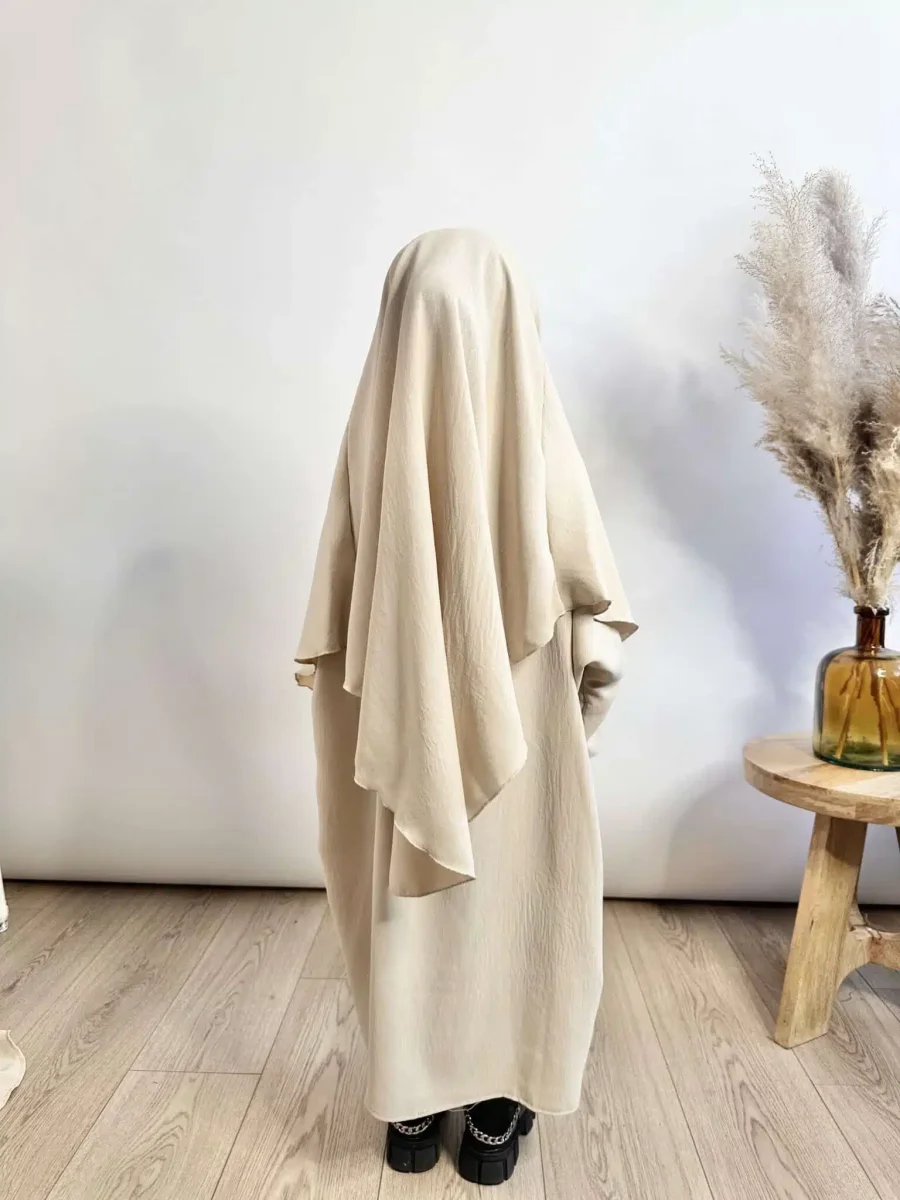 Le khimar inclus est conçu pour une praticité maximale. Avec ses deux bandes à nouer, il s’enfile en un clin d’œil et reste bien en place. Pas besoin de bonnet supplémentaire grâce à la bonne tenue du tissu opaque et léger. Il est idéal pour la prière, offrant un confort optimal et une couverture mastoura parfaite.