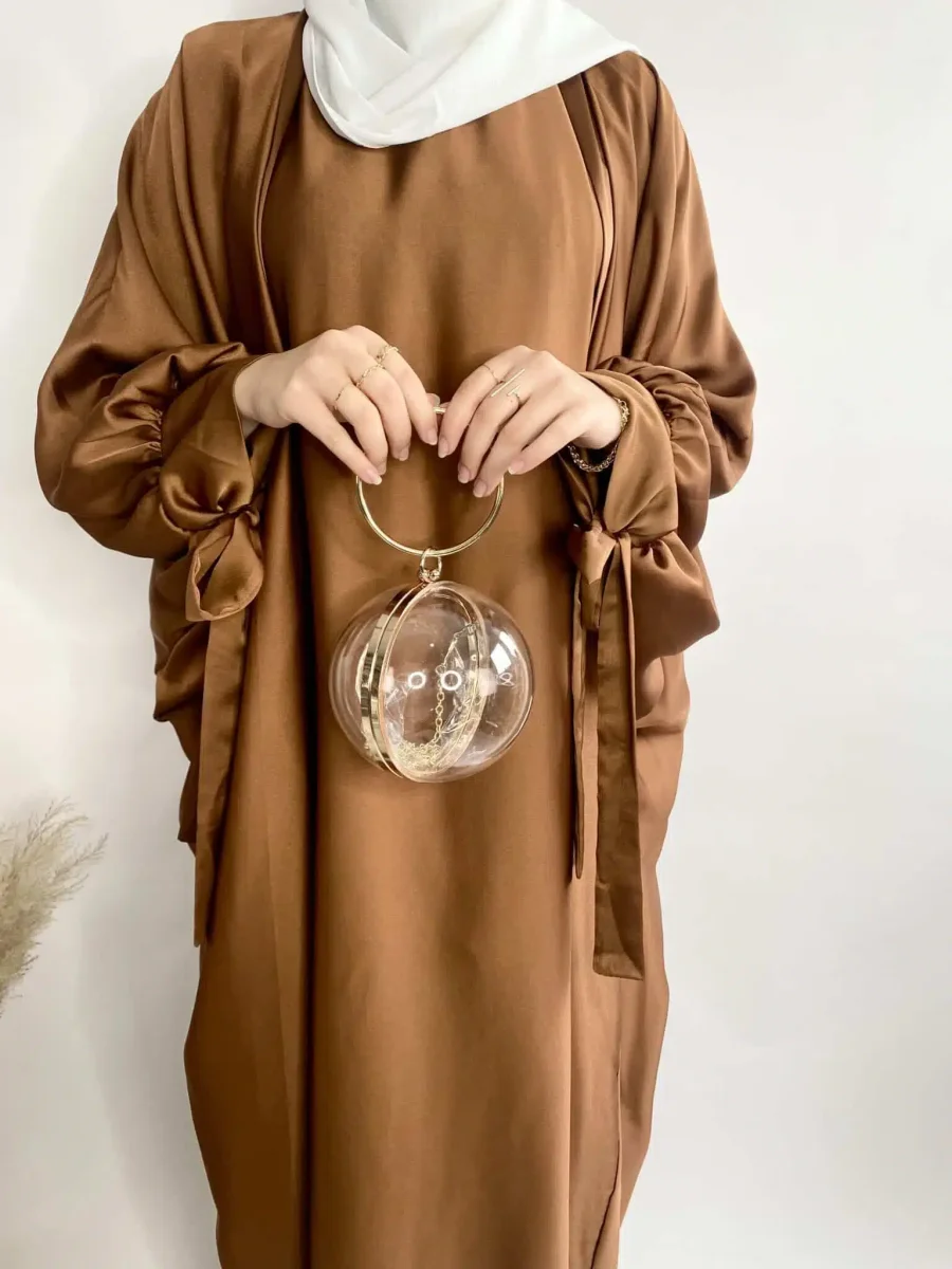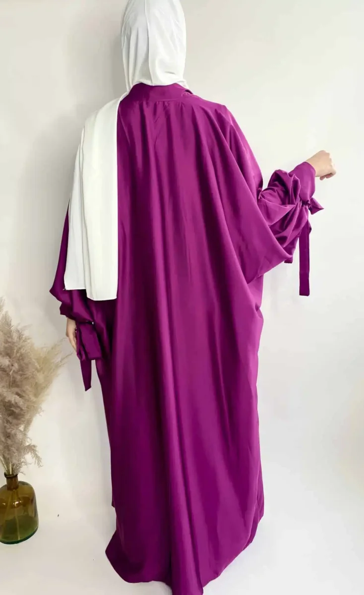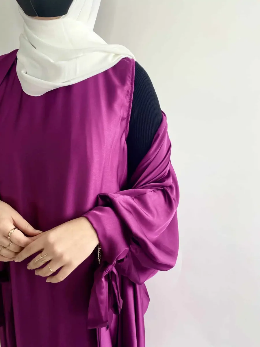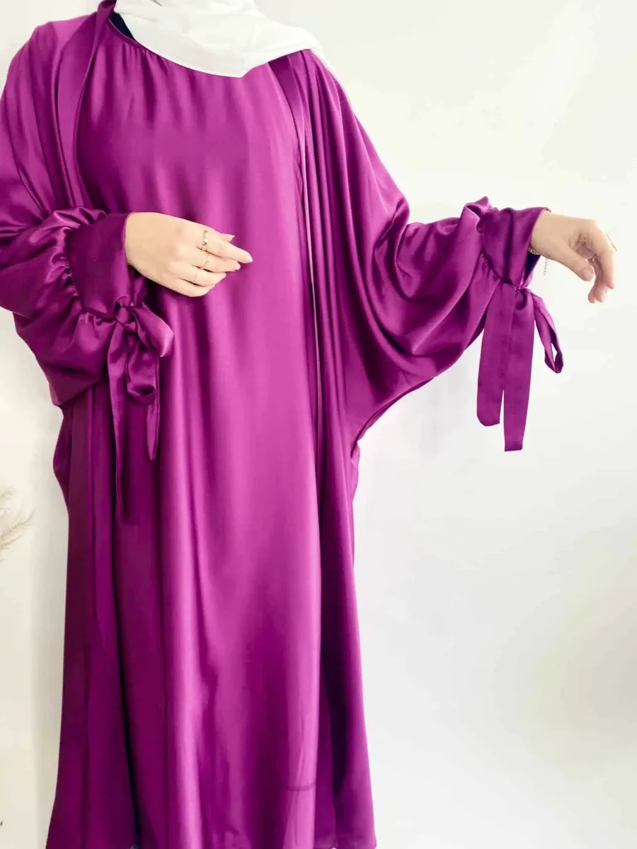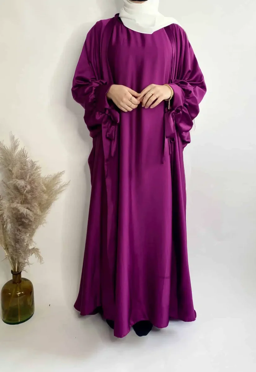 Description de l’ensemble Satiné Stella: Il est composé d’un kimono à manches papillon et d’une abaya. Le kimono est fabriqué dans un tissu satiné et est doté de deux ficelles au bout des manches pour les nouer pour donner une touche d’élégance. L’abaya est dans manches, elle est fluide et agréable au toucher. Composition de l’ensemble: Il est composé d’un kimono à manches papillon et d’une abaya. Le kimono est fabriqué dans un tissu satiné et est doté de deux ficelles au bout des manches pour les nouer. L’abaya est fluide et agréable au toucher, avec des ficelles au bout…