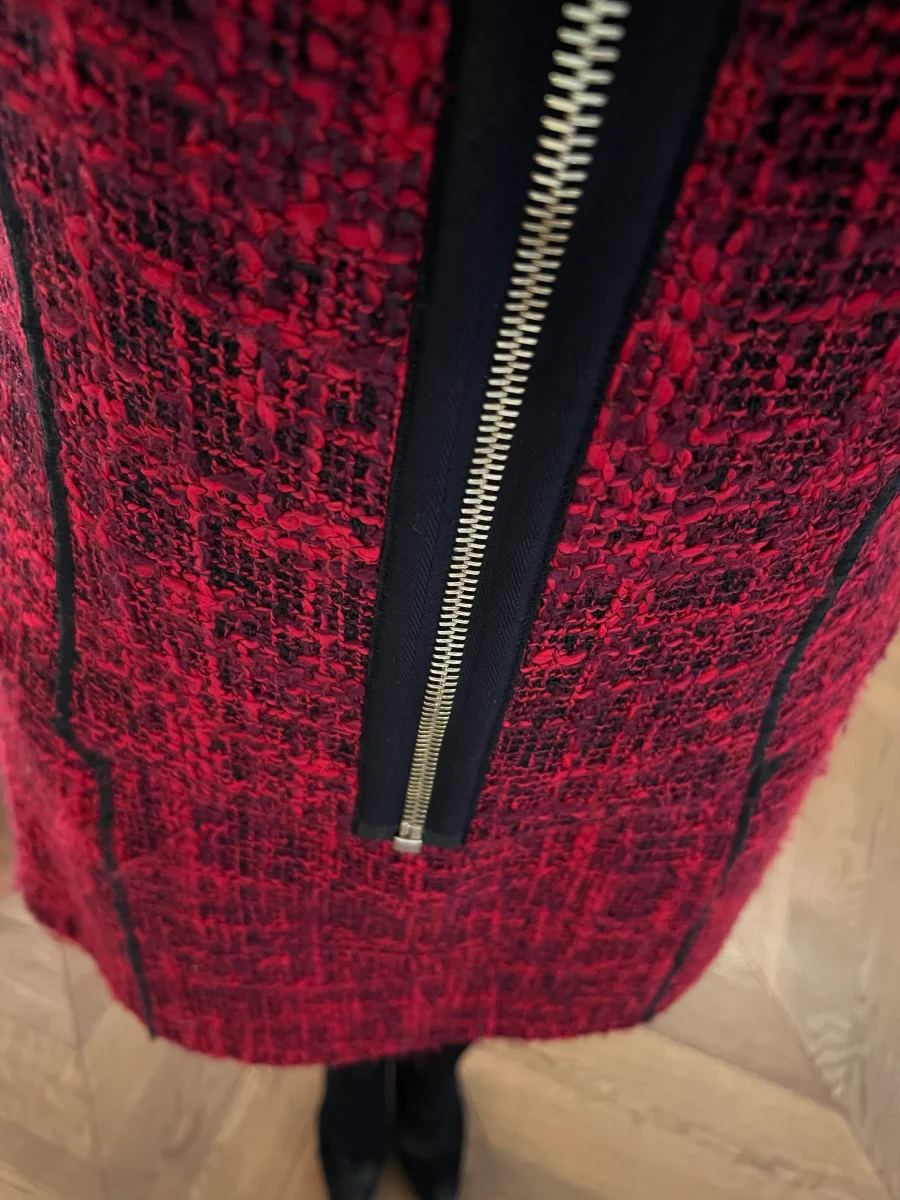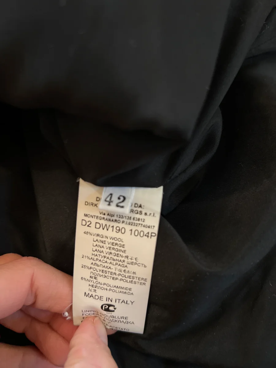 Très bon état général Jupe et Veste Marque : Dirk Bikkembergs Taille 44 IT (correspond à une taille 36-38) Laine, Alpaga,Polyester et Nylon. Pour la longueur, je mesure 1m71 Prix d’achat estimé neuf 145€