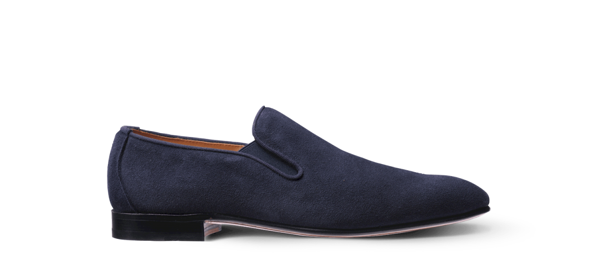 Mocassin à l’élastique non doublé en peau de koudou (antilope sud africaine) bleu marine.