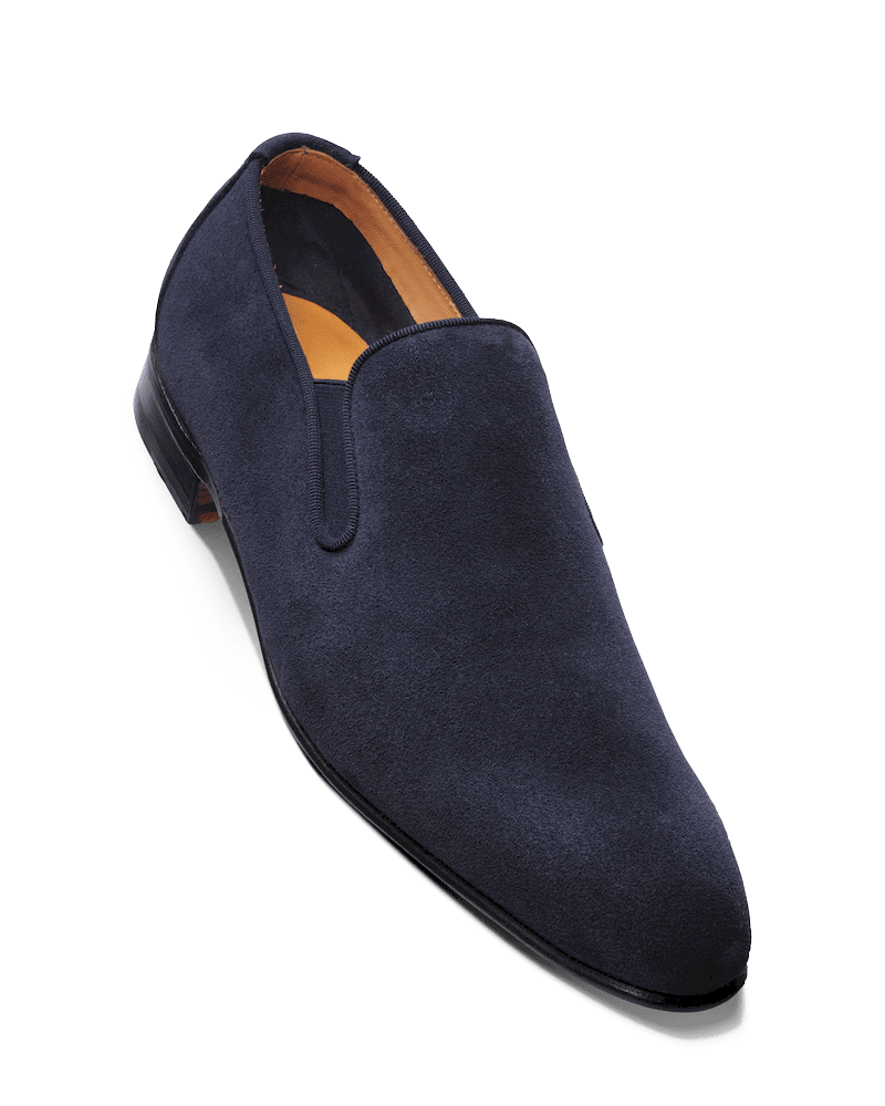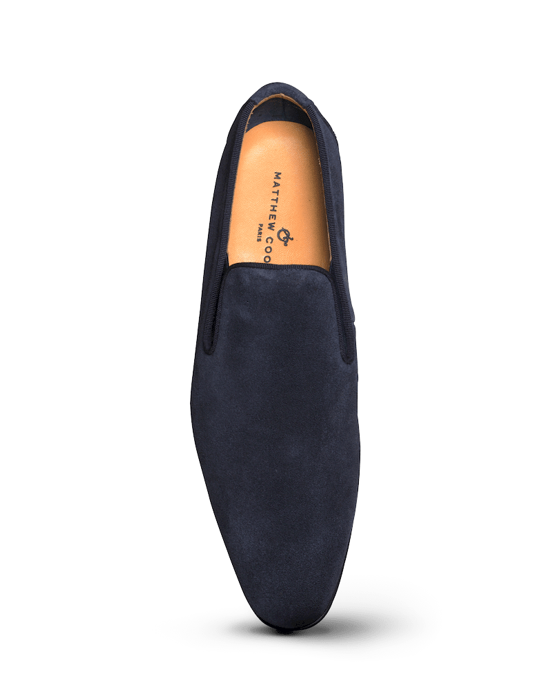 Mocassin à l’élastique non doublé en peau de koudou (antilope sud africaine) bleu marine. Jugé d’être encore plus confortable que nos fameux slippers.