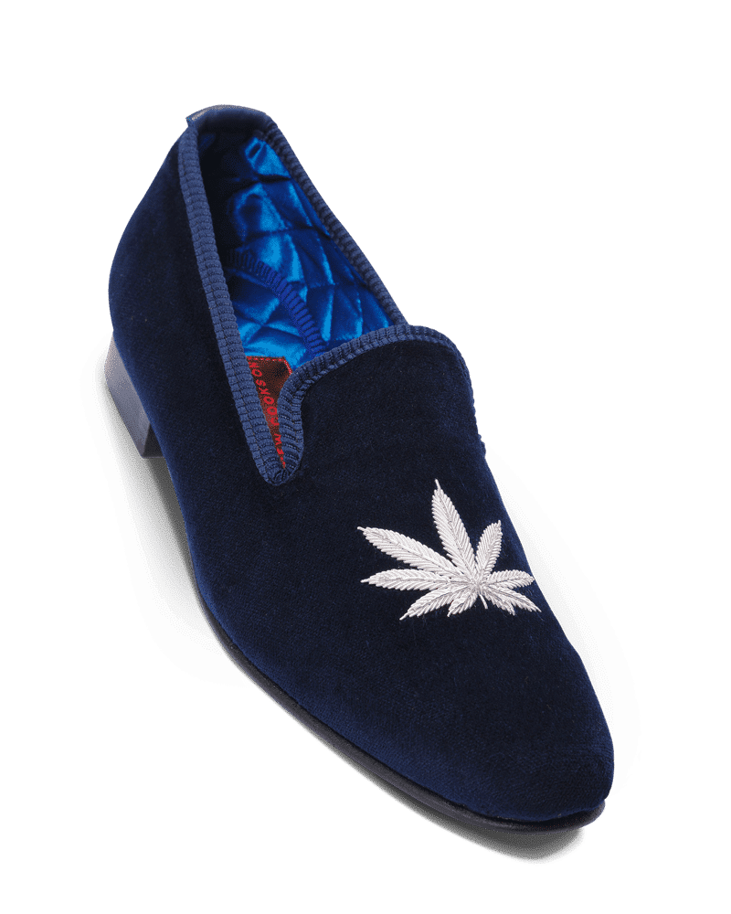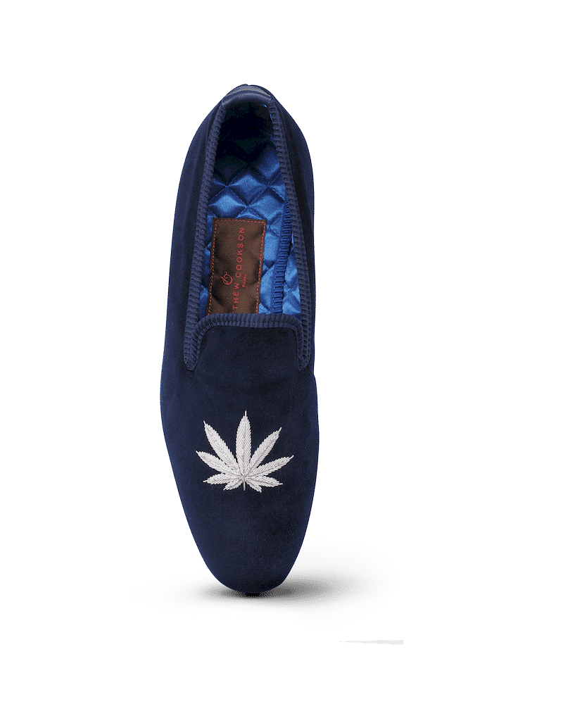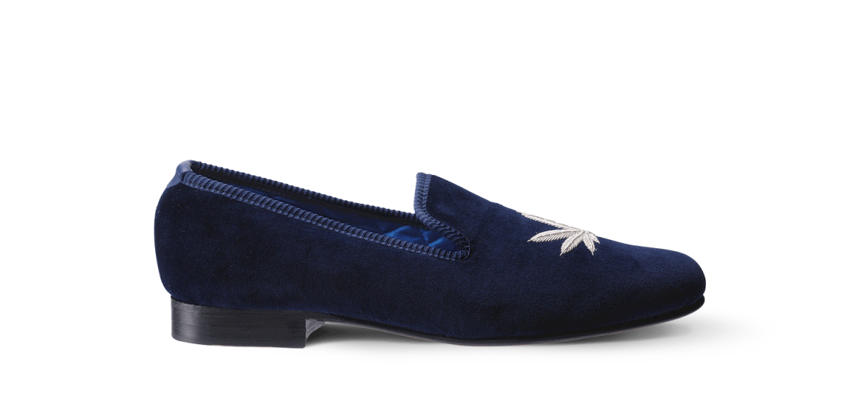 Les slippers feuille Matthew Cookson sont faites en velours de coton et brodées à la main, la doublure est en satin matelassé, le tout monté sur une fine semelle en cuir. Le summum de l’élégance et du confort.