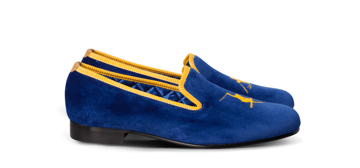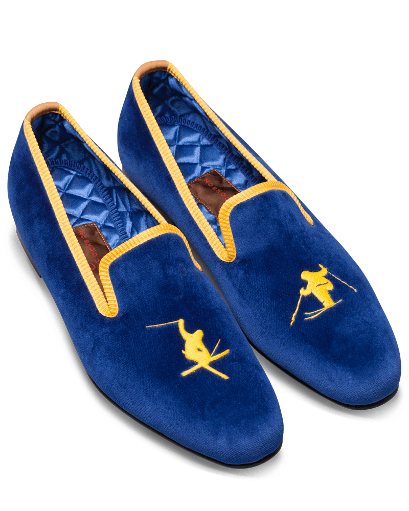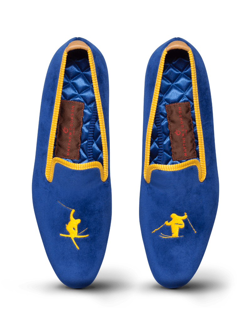 Les slippers freestyle Matthew Cookson sont faites en velours de coton et brodées à la main, la doublure est en satin matelassé, le tout monté sur une fine semelle en cuir. Le summum de l’élégance et du confort.