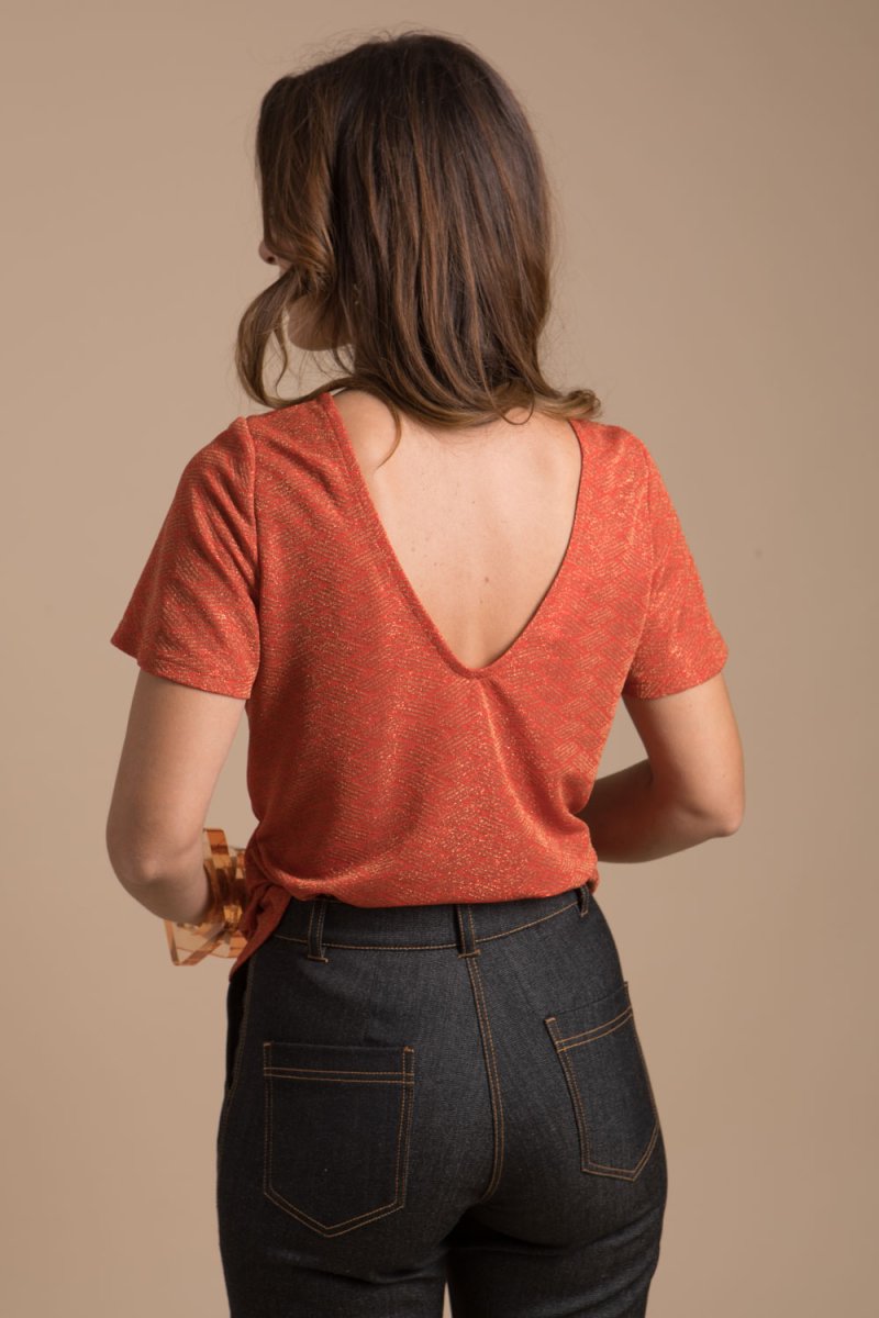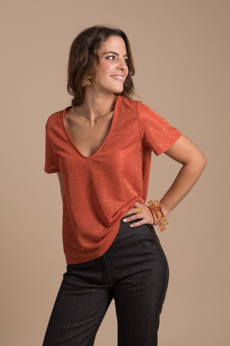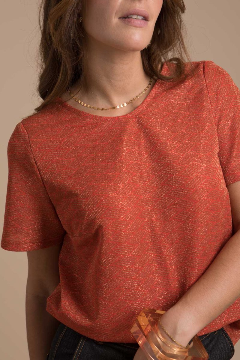 Ce joli top couleur rouge orangé sublimé d’une touche dorée est confectionné dans un beau tissu en viscose et polyester.
